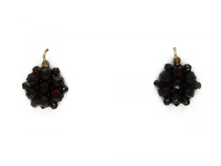 A lovely pair of VictorianJewellery made in the the Victorian era (1839-1901). earrings with good colour, facetedA faceted stone has small, flat-cut surfaces that make a sparkling effect on transparent stones. Facets act as both mirrors and windows. Reflecting light and channelling light into a stone where it refracts and re-emerges. Bohemian Garnets set in low caratThe unit of weight for a diamond or other gemstone and also for a pearl. Abbreviated ‘ct’, 1 carat is equal to 0.2 grams. In reference to gold, a unit of purity or fineness of gold and gold alloy, expressed as a number out of 24 parts by weight, e.g. ’24 carat’ signifies pure gold, ’18 carat’ 18/24th gold in the alloy, et cetera. Also abbreviated as ‘c… gold which were made circa 1880.