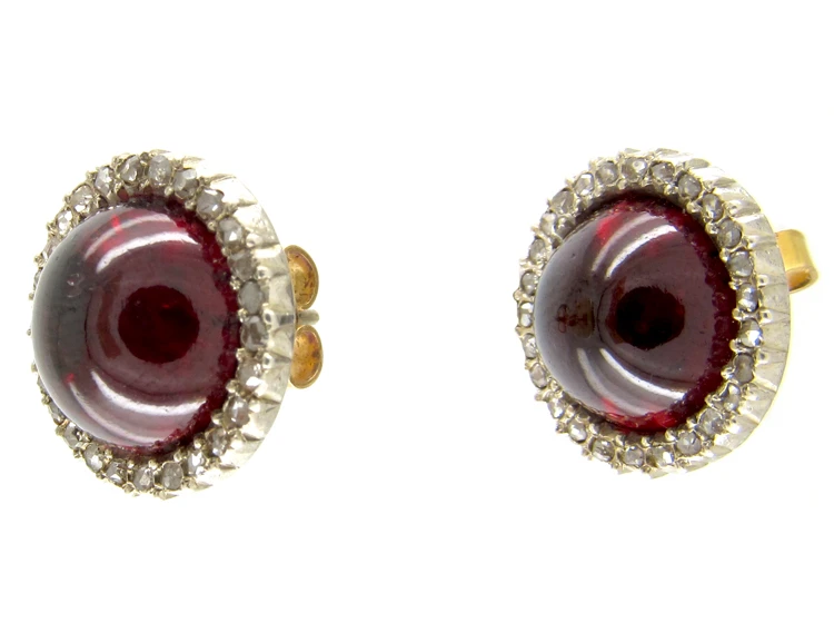 garnetDescribes a group of several closely related minerals. Garnets come in a variety of colours, however the most common colour is dark red. In descriptions, ‘garnet’ tends to refer to dark red stones unless otherwise specified. and rose diamondA precious, lustrous gemstone made of highly compressed carbon. Diamonds are one of the hardest materials known to mankind. Colours of diamonds range from colourless, yellow, orange and brown to almost black. Natural coloured (or ‘fancy’) diamonds can be extremely rare. The cut, colour, clarity and carat weight of a diamond are the criteria jewellers use… earrings. They were made in the VictorianJewellery made in the the Victorian era (1839-1901). period when garnets were in high fashion. It was a rich look, which often contrasted the garnets with diamonds or enamelA pigmented glass-like material used in powdered form and fused onto the metal surface of a piece of jewellery. on gold. It was known as ‘”the Holbeinesque period” as it harked back to Elizabethan days.