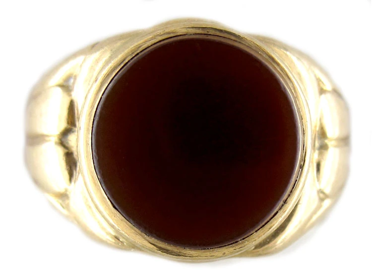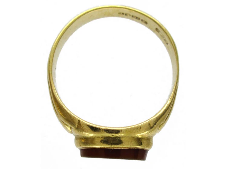 A cornelian signet ringA ring with a central plaque on which one’s initials, a seal, or a crest is engraved. which can be engraved with either a crest or monogram. We can arrange this if necessary. It is 18ct75% pure gold (or 750 parts pure gold and 250 parts other metals) gold and dated 1954.