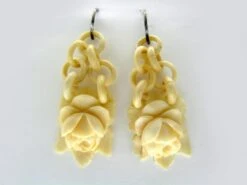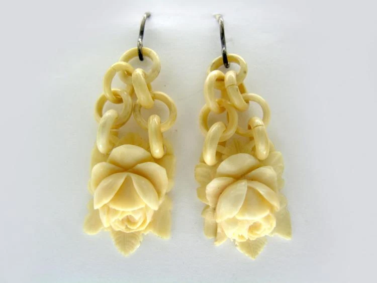 Pretty, floral drop ivory earrings. These would probably have been carved in the maritime town of Dieppe, France, in circa 1850/60. Dieppe was famous for crafts made of bone and ivory. They are in good condition, with silverA metallic element which is malleable and ductile, and white in colour, making it ideal for use in jewellery. It is usually mixed with copper to improve its hardness.