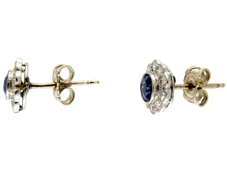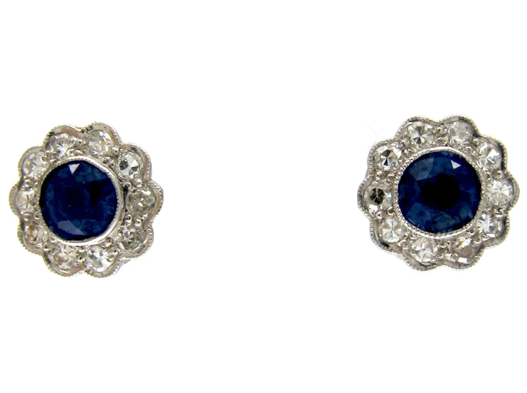 and diamondA precious, lustrous gemstone made of highly compressed carbon. Diamonds are one of the hardest materials known to mankind. Colours of diamonds range from colourless, yellow, orange and brown to almost black. Natural coloured (or ‘fancy’) diamonds can be extremely rare. The cut, colour, clarity and carat weight of a diamond are the criteria jewellers use… clusterA group of small diamonds or colourful gemstones grouped together to form a cluster, mimicking the look of a larger gem. Often this group can surround a larger center stone. earrings. They were made circa 1910 and are platinumDerives from the Spanish word ‘platina’ meaning ‘little silver’. Acknowledged since the 1900s, platinum’s durability and natural brightness has been and still is today highly treasured A metallic element prized for its rarity, whiteness, high tensile strength and insusceptibility to corrosion, platinum first became widely used in jewellery in the late ninete…. The diamonds are evenly matched and the sapphires are a lovely CeylonSri Lankan (Ceylon was the country’s former name until 1972) blue.