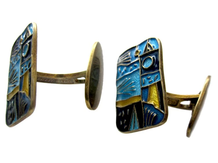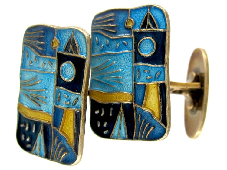David Andersen designed a collection in the 1950s to represent the four and different seasons of the year. These cufflinks are Spring. They are beautifully enamelled and are on silverA metallic element which is malleable and ductile, and white in colour, making it ideal for use in jewellery. It is usually mixed with copper to improve its hardness.