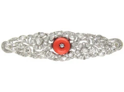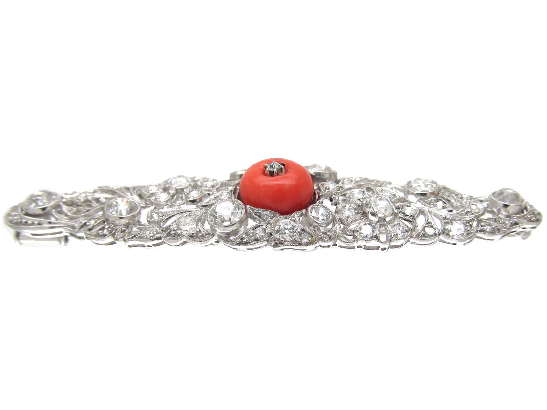 A very stylish and beautiful  white goldWhite gold is an alloy of gold and at least one other white metal – most often nickel or palladium (both of which act as a bleaching agent to reduce the natural yellow colour of the gold). brooch which has been set with good white well matched diamonds and has a central coralAn organic gem, calcium carbonate with a trace of carotene, deposited by tiny sea creatures living in the depths of warm seas in huge colonies. It grows in branches that look like underwater trees. Coral is believed to be one of the oldest forms of gemstone jewellery, with some pieces dating back as far as 23,000 BC. bead which has a diamondA precious, lustrous gemstone made of highly compressed carbon. Diamonds are one of the hardest materials known to mankind. Colours of diamonds range from colourless, yellow, orange and brown to almost black. Natural coloured (or ‘fancy’) diamonds can be extremely rare. The cut, colour, clarity and carat weight of a diamond are the criteria jewellers use… set in the centre. It was made circa 1920-1930.