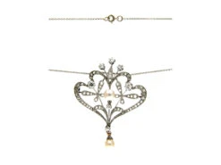 A beautifully designed Art NouveauA movement within the arts, particularly jewellery, evolving out of a response to mass production and the industrial revolution (1890-1915). Jewellery of this period was heavily influenced by nature and femininity, with its sweeping lines and organic motifs. platinumDerives from the Spanish word ‘platina’ meaning ‘little silver’. Acknowledged since the 1900s, platinum’s durability and natural brightness has been and still is today highly treasured A metallic element prized for its rarity, whiteness, high tensile strength and insusceptibility to corrosion, platinum first became widely used in jewellery in the late ninete… and diamondA precious, lustrous gemstone made of highly compressed carbon. Diamonds are one of the hardest materials known to mankind. Colours of diamonds range from colourless, yellow, orange and brown to almost black. Natural coloured (or ‘fancy’) diamonds can be extremely rare. The cut, colour, clarity and carat weight of a diamond are the criteria jewellers use… and natural pearlA pearl-bearing mollusc that has not been tampered with by man to produce a cultivated pearl will produce a ‘natural pearl’. pendant on the original platinum chain. Pieces such as this one are difficult to source and are very popular. It is in very good condition.