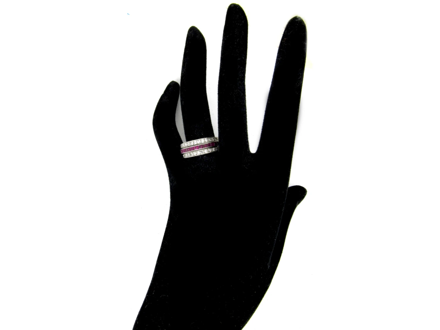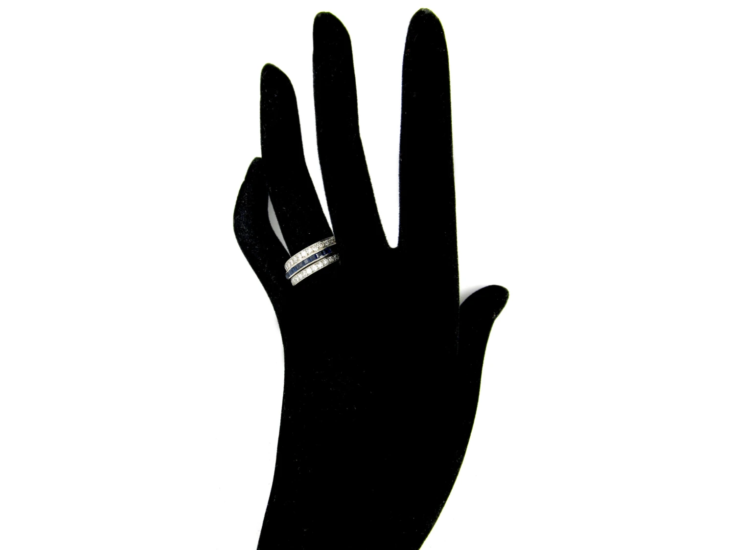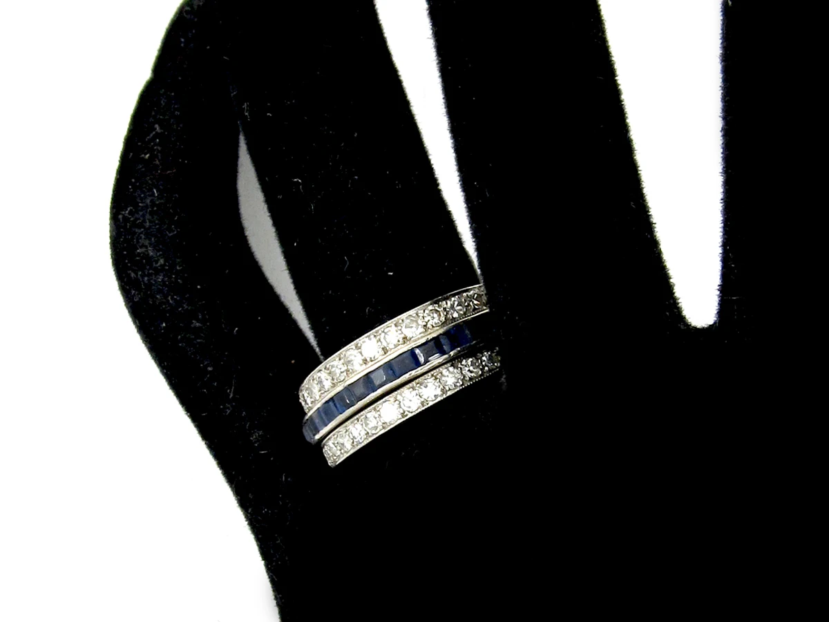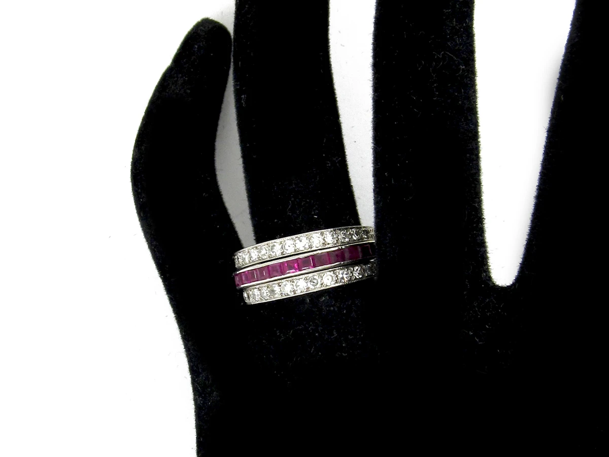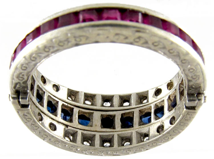 A lovely Art DecoA movement within the arts between the two Great Wars (1920-1935) across Europe and the US, characterized by its clean, geometric designs. The aesthetic was intended to celebrate an age of progress and the modernity of the machine. ring which was a very popular design in the 1920s and 1930s. You really are buying two rings as you can swivel it to the rubyOne of the most valuable gemstones on earth. From the corundum family, the red variety being ruby and the blue, sapphire. With the exception of the diamond, corundum is the hardest of the gemstones on the Mohs scale scoring a 9. section or the sapphireBlue is the best-known colour for this gemstone but it can be found in all colours of the spectrum. After diamond, sapphire is the hardest gemstone.