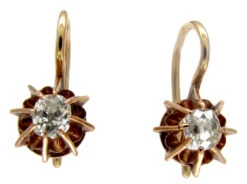 A pretty pair of single stone diamondA precious, lustrous gemstone made of highly compressed carbon. Diamonds are one of the hardest materials known to mankind. Colours of diamonds range from colourless, yellow, orange and brown to almost black. Natural coloured (or ‘fancy’) diamonds can be extremely rare. The cut, colour, clarity and carat weight of a diamond are the criteria jewellers use… earrings. The diamonds are 25 pointsA unit of weight for a diamond, being one-hundredth of a metric carat. It is used for weights that are decimal fractions of a carat, and all figures after the second decimal point are, in the diamond and jewellery trade, generally discarded. each and they are set in 18ct75% pure gold (or 750 parts pure gold and 250 parts other metals) gold. They were made circa 1910-1920. The wires are very secure as they have hinged catches.