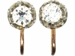 A useful pair of diamondA precious, lustrous gemstone made of highly compressed carbon. Diamonds are one of the hardest materials known to mankind. Colours of diamonds range from colourless, yellow, orange and brown to almost black. Natural coloured (or ‘fancy’) diamonds can be extremely rare. The cut, colour, clarity and carat weight of a diamond are the criteria jewellers use… solitaireAn enduringly popular style of engagement ring featuring a single diamond or gemstone set on a band. earrings that were made circa 1910-1920. The diamonds have been set in platinumDerives from the Spanish word ‘platina’ meaning ‘little silver’. Acknowledged since the 1900s, platinum’s durability and natural brightness has been and still is today highly treasured A metallic element prized for its rarity, whiteness, high tensile strength and insusceptibility to corrosion, platinum first became widely used in jewellery in the late ninete… with 15ct62.5% pure gold (or 625 parts pure gold and 375 parts other metals). Popular during the Victorian, Edwardian and Art Deco eras but was discontinued in the mid-1930s. gold screw fittings. Each diamond is 30 pointsA unit of weight for a diamond, being one-hundredth of a metric carat. It is used for weights that are decimal fractions of a carat, and all figures after the second decimal point are, in the diamond and jewellery trade, generally discarded. and a good brilliant white. At that time it was not usual to have pierced ears, however we can easily change these to wires if wanted.