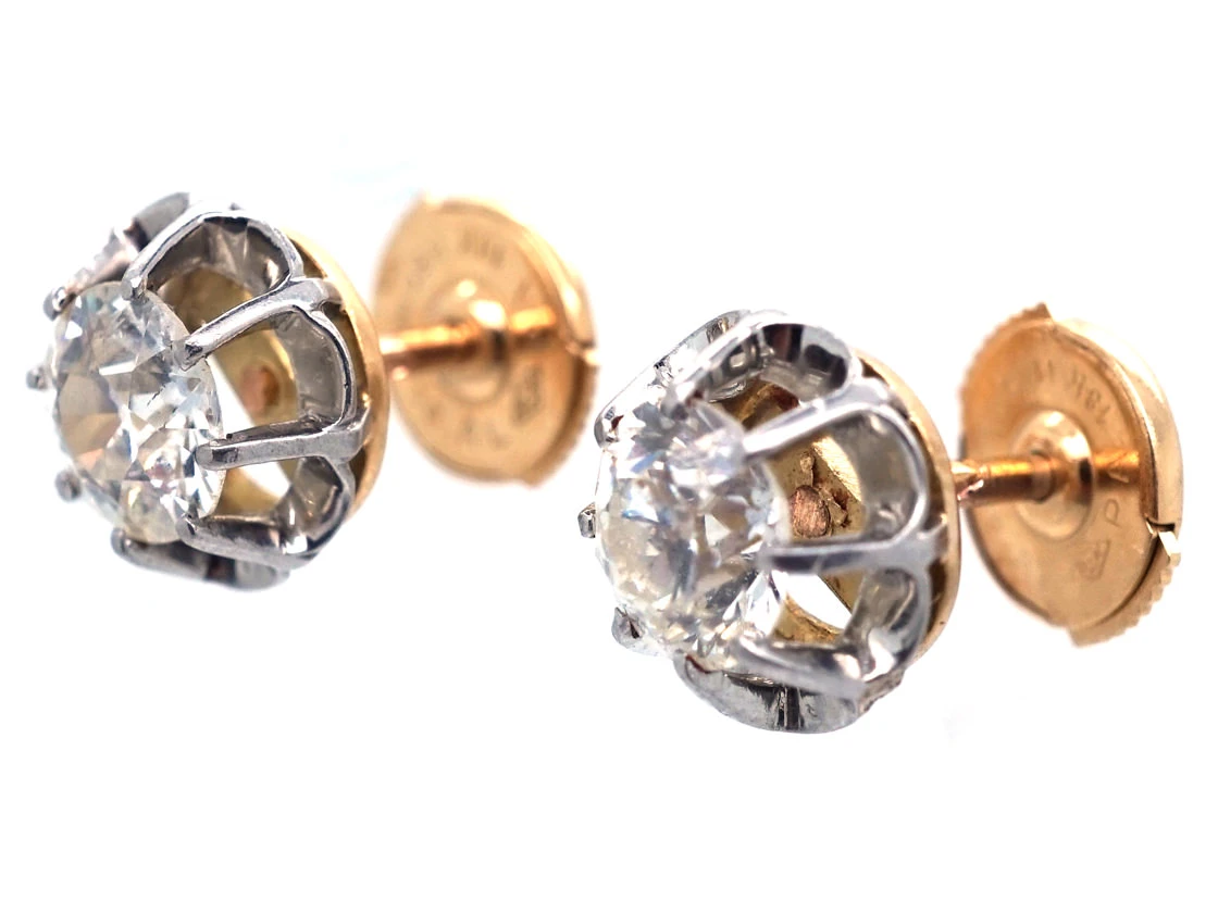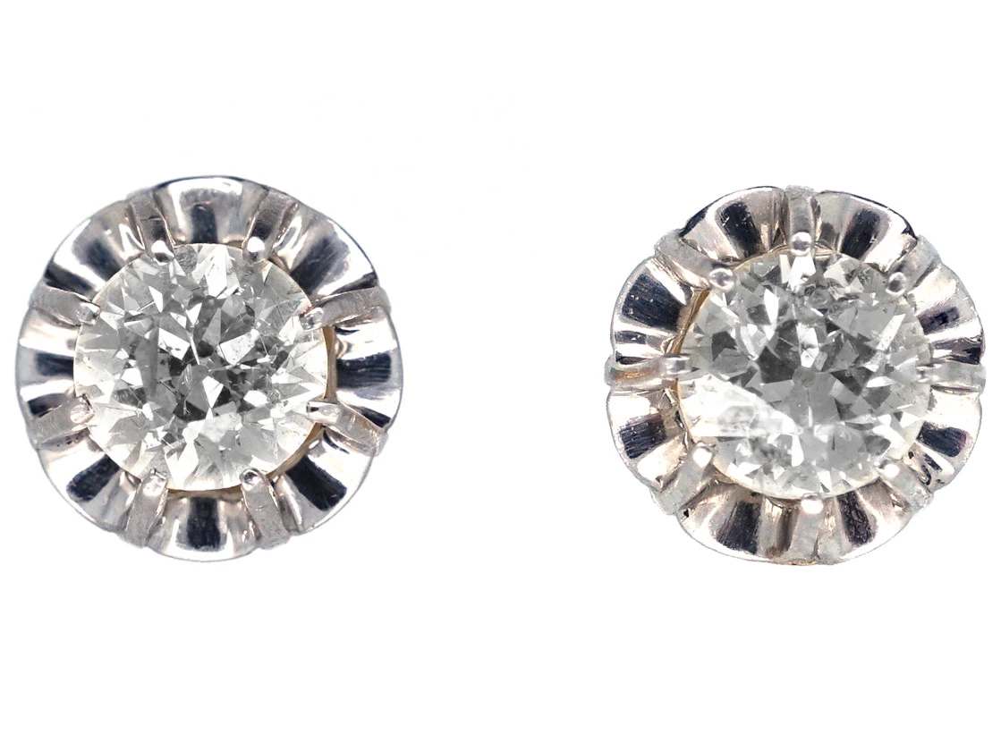 A good pair of solitaireAn enduringly popular style of engagement ring featuring a single diamond or gemstone set on a band. diamondA precious, lustrous gemstone made of highly compressed carbon. Diamonds are one of the hardest materials known to mankind. Colours of diamonds range from colourless, yellow, orange and brown to almost black. Natural coloured (or ‘fancy’) diamonds can be extremely rare. The cut, colour, clarity and carat weight of a diamond are the criteria jewellers use… earrings. Each diamond weighs at least 75 pointsA unit of weight for a diamond, being one-hundredth of a metric carat. It is used for weights that are decimal fractions of a carat, and all figures after the second decimal point are, in the diamond and jewellery trade, generally discarded.. They are well matched bright white stones. They are complimented by a platinumDerives from the Spanish word ‘platina’ meaning ‘little silver’. Acknowledged since the 1900s, platinum’s durability and natural brightness has been and still is today highly treasured A metallic element prized for its rarity, whiteness, high tensile strength and insusceptibility to corrosion, platinum first became widely used in jewellery in the late ninete… scalloped edge and 18ct75% pure gold (or 750 parts pure gold and 250 parts other metals) gold backs.