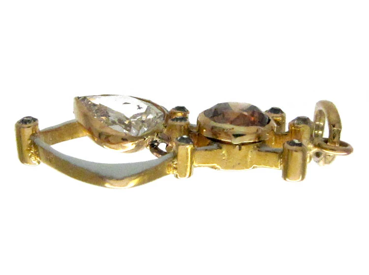 A really pretty 18ct75% pure gold (or 750 parts pure gold and 250 parts other metals) gold, enamelA pigmented glass-like material used in powdered form and fused onto the metal surface of a piece of jewellery. and diamondA precious, lustrous gemstone made of highly compressed carbon. Diamonds are one of the hardest materials known to mankind. Colours of diamonds range from colourless, yellow, orange and brown to almost black. Natural coloured (or ‘fancy’) diamonds can be extremely rare. The cut, colour, clarity and carat weight of a diamond are the criteria jewellers use… drop pendant. It was made in the Austria during the Austro-Hungarian period, circa 1890, and is set with a clear heart shaped diamond with a round pinkish brown colour diamond above, and small diamonds at intervals. The edges are a cream coloured enamel. It is unusual and looks beautiful when worn.