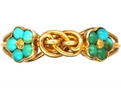 The knot is traditionally seen as a symbol of love and marriage, so this lovely 15ct62.5% pure gold (or 625 parts pure gold and 375 parts other metals). Popular during the Victorian, Edwardian and Art Deco eras but was discontinued in the mid-1930s. gold ring was given with love in the 1830s. It has been set with turquoiseTurquoise is an opaque gem and is often formed in what is called matrix, a black or brown veining derived from the host rock in which the gem forms. In fine jewellery, unblemished sky blue turquoise is the ideal, although regularly patterned matrix turquoise is also sought-after. which means “Forget me not” after the flower of the same name. A perfect ring to give as a token of love.
