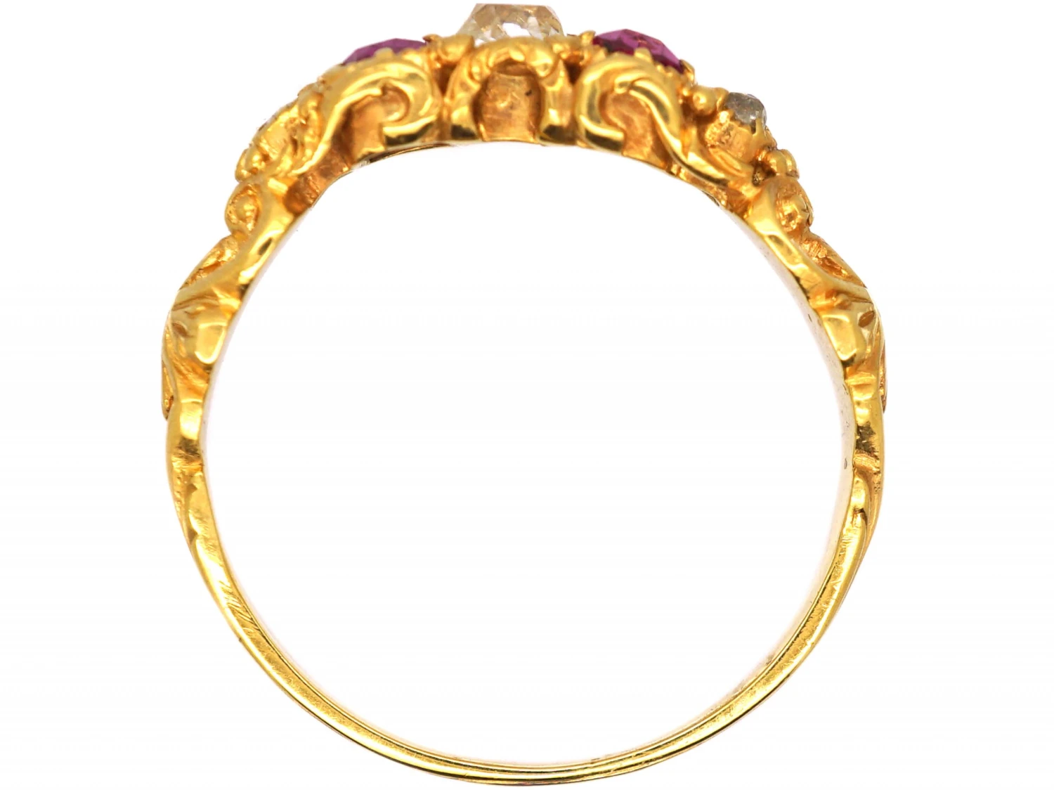 This is a beautiful 18ct75% pure gold (or 750 parts pure gold and 250 parts other metals) gold ring that was made circa 1830. It has been clawA precious metal prong used to hold a gemstone in place. set with two rubies and three claw set old mine cutAn 18th, 19th and early 20th century diamond shape, typically cushion or asymmetrical, marked by a small table, a high crown and a large culet. Culets are the small flat facets at the bottom of a stone which appear to the untrained eye as a hole in the middle of the stone. Before the advent of modern machinery which allows for the precise faceting we see tod… diamonds within a highly ornate border with a three leaf motif on the shouldersThe point on a ring where the central section meets the shank or band, often carved, decorated or inlaid with small diamond accent stones.. The shankThe circle of metal that attaches to the decorative part of a ring and encircles the finger. is a fluted design. I am always amazed that these charming early rings survive so well over the years and hopefully this ring will find a new home and will continue to be loved and cared for.
