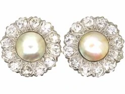 A good pair of naturalA natural stone is called such because it has not been subjected to any treatments. split pearlNatural pearls are an organic gem formed inside live mollusc shells and come in all shapes and sizes. They are formed as the result of a natural irritant within the mollusc’s mantle and as a defence, layers of iridescent nacre form over the top of it, creating a pearl. and diamondA precious, lustrous gemstone made of highly compressed carbon. Diamonds are one of the hardest materials known to mankind. Colours of diamonds range from colourless, yellow, orange and brown to almost black. Natural coloured (or ‘fancy’) diamonds can be extremely rare. The cut, colour, clarity and carat weight of a diamond are the criteria jewellers use… earrings that were made circa 1930. Each earring has a natural split pearl in the centre surrounded by twelve transitional cutDirect descendants of the Old European Cut, this progressive cuts saw an evolution toward a larger table, a lower crown, and a smaller culet than previous cuts. However, unlike later brilliants, the girdles of these stones remained unfaceted. Considered a precursor to both the Modern Round Brilliant and the Ideal cuts. diamonds in unusual pear shaped settings. They are 18ct75% pure gold (or 750 parts pure gold and 250 parts other metals) yellow gold with 18ct white goldWhite gold is an alloy of gold and at least one other white metal – most often nickel or palladium (both of which act as a bleaching agent to reduce the natural yellow colour of the gold). tops. They are impressive looking when worn.