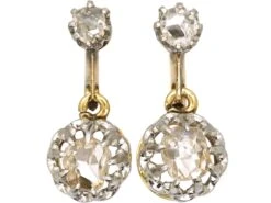 A sweet pair of 18ct75% pure gold (or 750 parts pure gold and 250 parts other metals) gold and platinumDerives from the Spanish word ‘platina’ meaning ‘little silver’. Acknowledged since the 1900s, platinum’s durability and natural brightness has been and still is today highly treasured A metallic element prized for its rarity, whiteness, high tensile strength and insusceptibility to corrosion, platinum first became widely used in jewellery in the late ninete… earrings that were most likely made in Holland circa 1910. Each earring has been set with two rose diamonds within stylised fleur de lys claws. They have secure hinge back fittings.