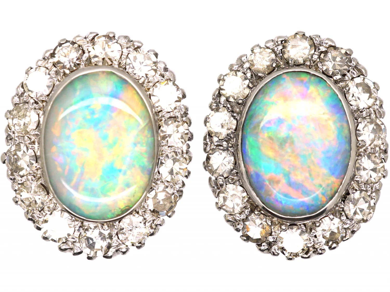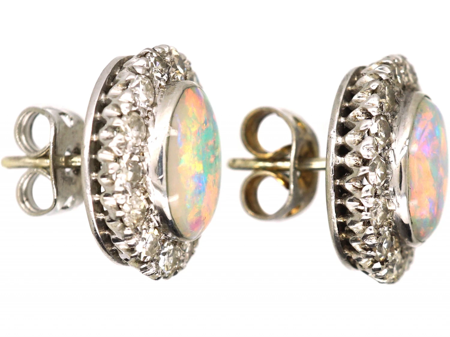 A useful pair of 18ct75% pure gold (or 750 parts pure gold and 250 parts other metals) white goldWhite gold is an alloy of gold and at least one other white metal – most often nickel or palladium (both of which act as a bleaching agent to reduce the natural yellow colour of the gold)., opalOpals occur in a range of body colours from white, black or grey, bright orangey red and a pale watery colour. The most precious opals show strong colour contrast and generally have a dark body colour with a vivid array of colour play. and diamondA precious, lustrous gemstone made of highly compressed carbon. Diamonds are one of the hardest materials known to mankind. Colours of diamonds range from colourless, yellow, orange and brown to almost black. Natural coloured (or βfancyβ) diamonds can be extremely rare. The cut, colour, clarity and carat weight of a diamond are the criteria jewellers use… clusterA group of small diamonds or colourful gemstones grouped together to form a cluster, mimicking the look of a larger gem. Often this group can surround a larger center stone. earrings that were made circa 1910. The rub over set opals display high flashes of blue and green with red undertones. Around them on a lower level are well matched bright white diamonds that compliment the opals. They have secure post and scroll fittings and look very neat on the ear.
