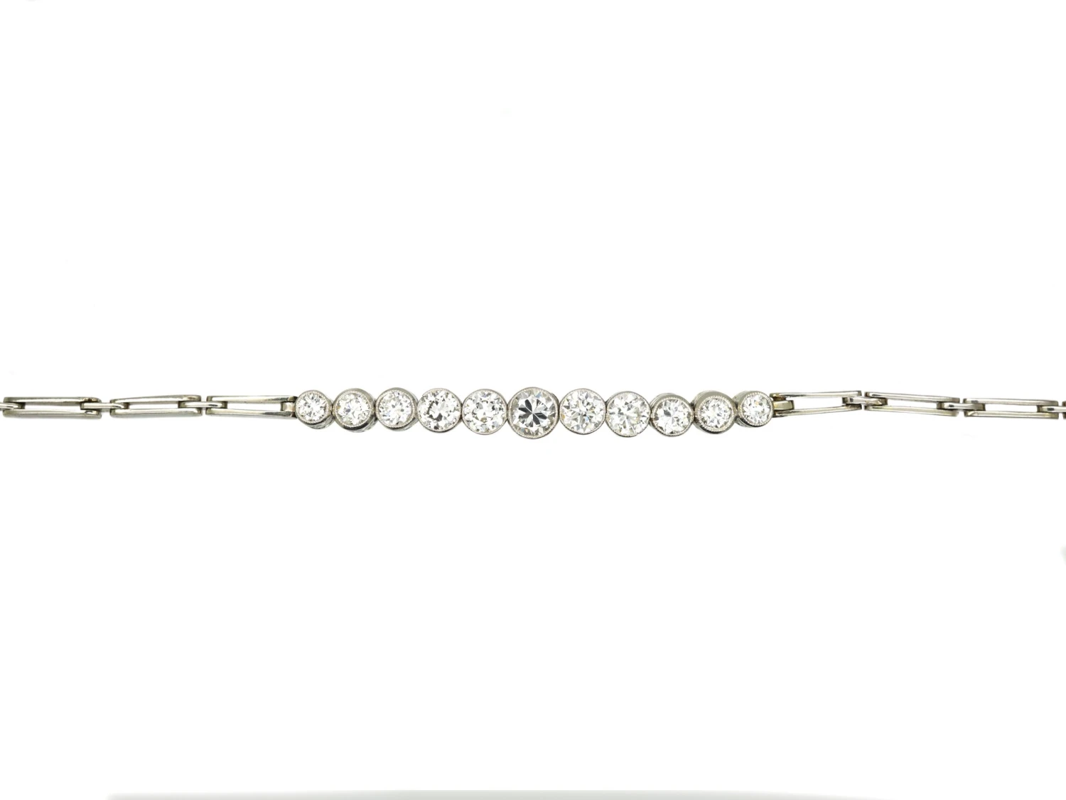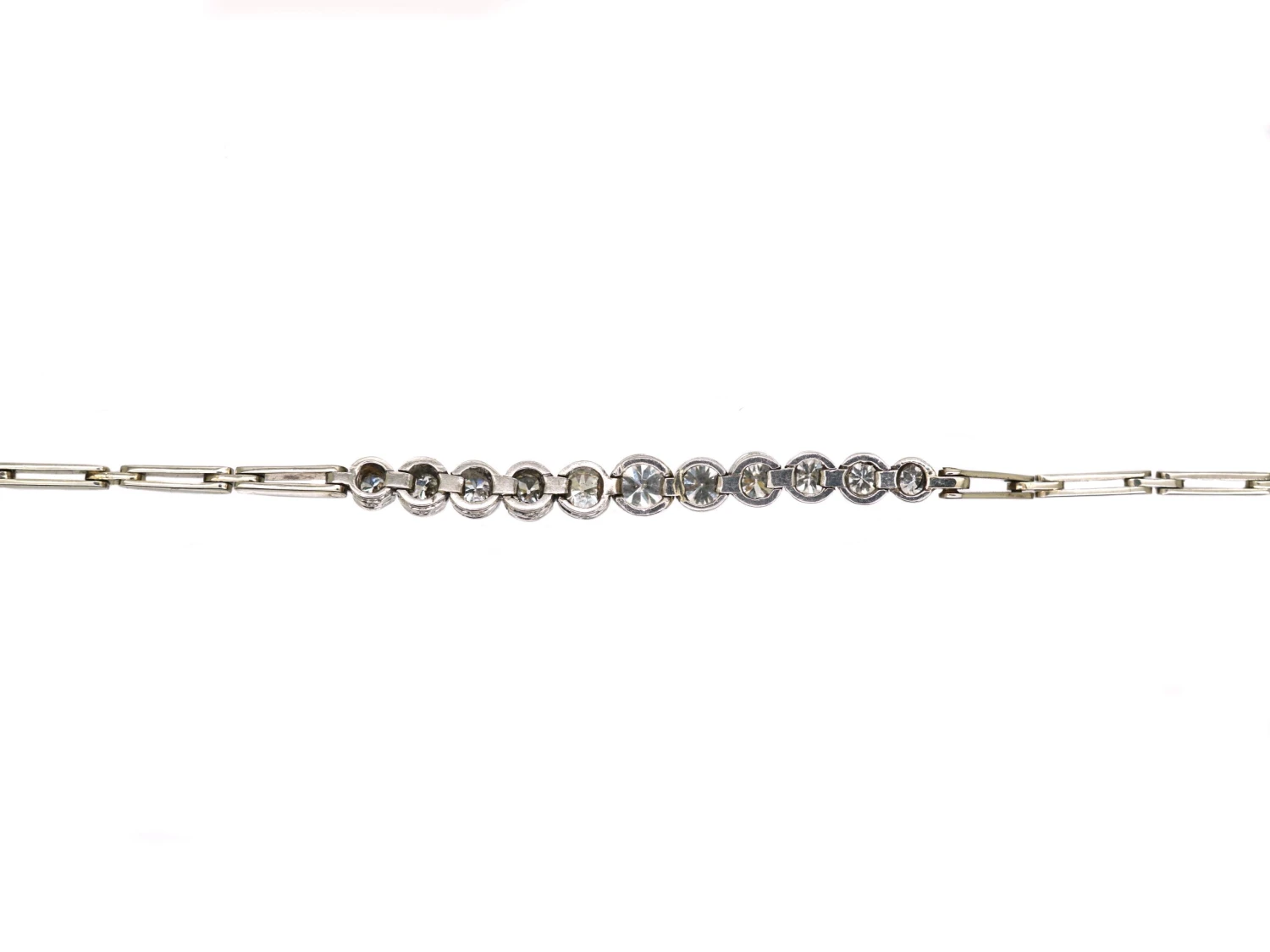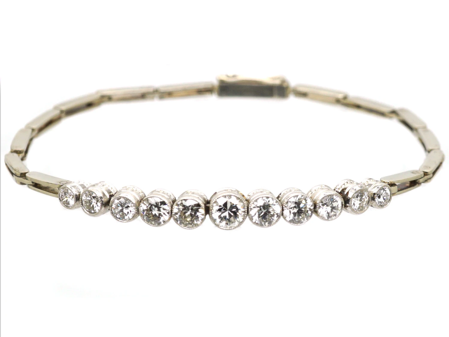 A good looking 18ct white gold and platinum bracelet that was made circa 1920 and is most likely of German origin. It has been set with eleven bright white transition cut graduated diamonds within millgrained rub over settings. They have an approximate total weight of just over one and half carats.  The strap is narrow and the tongue clasp has a hinged clip for added security.