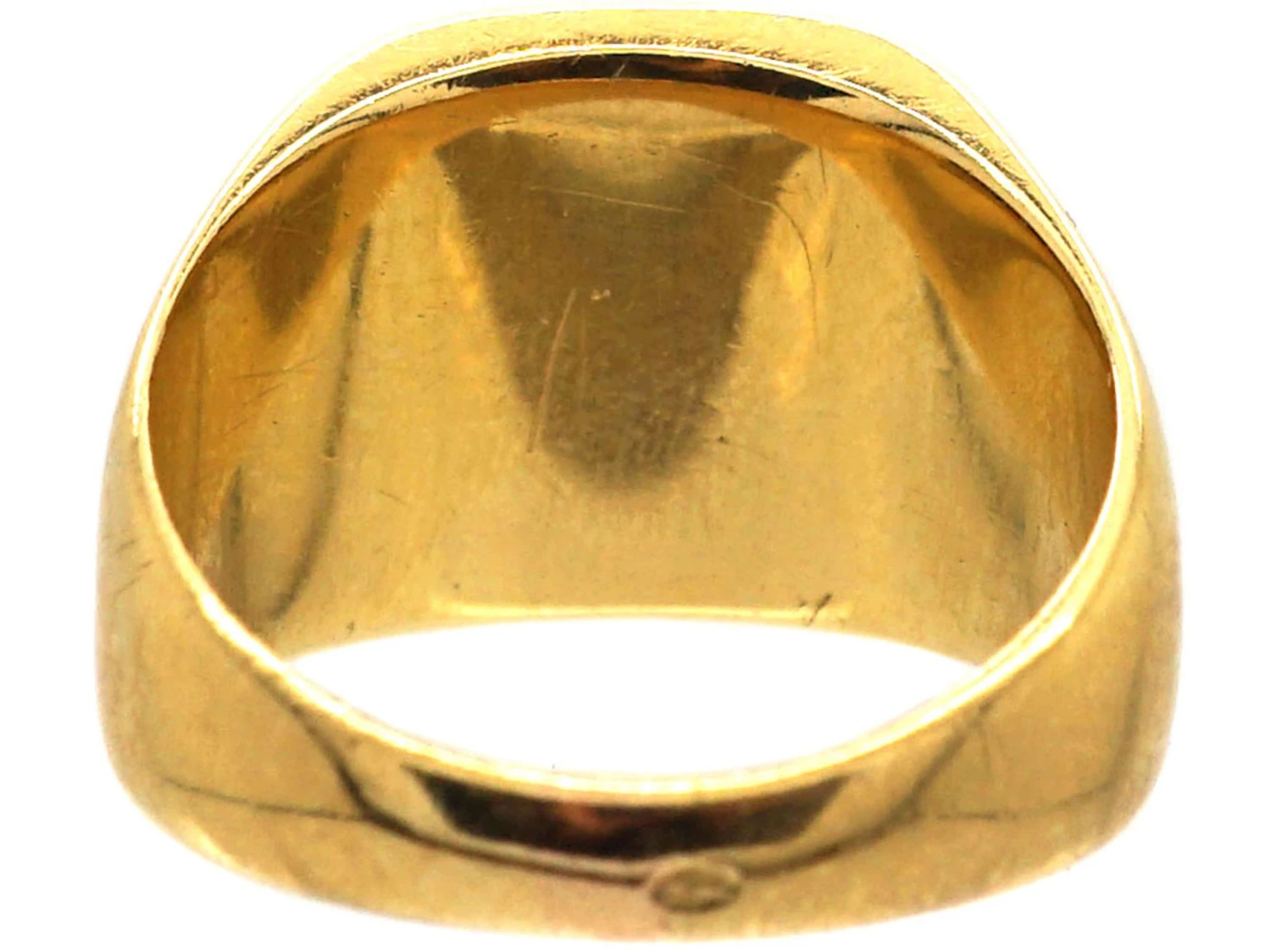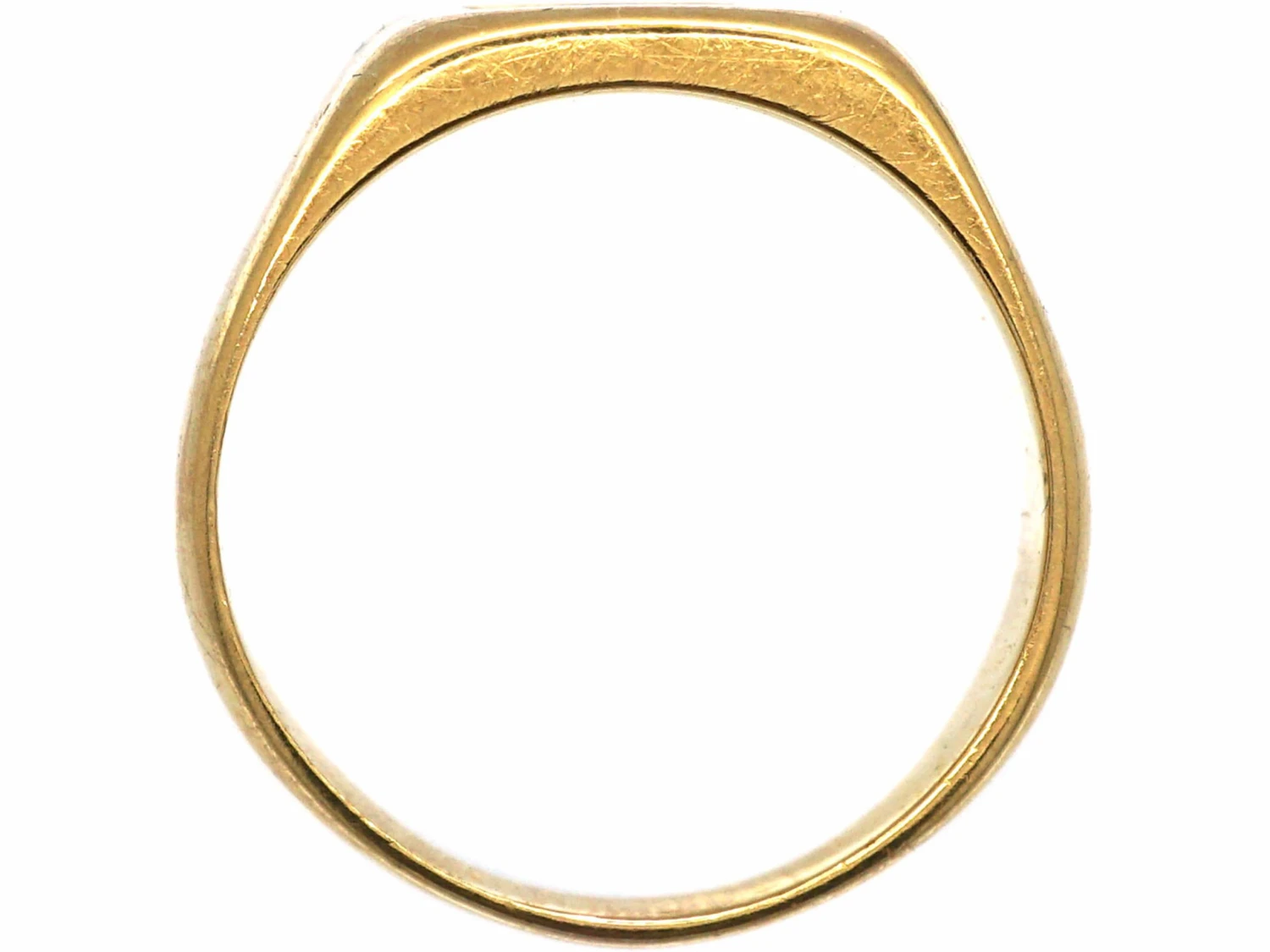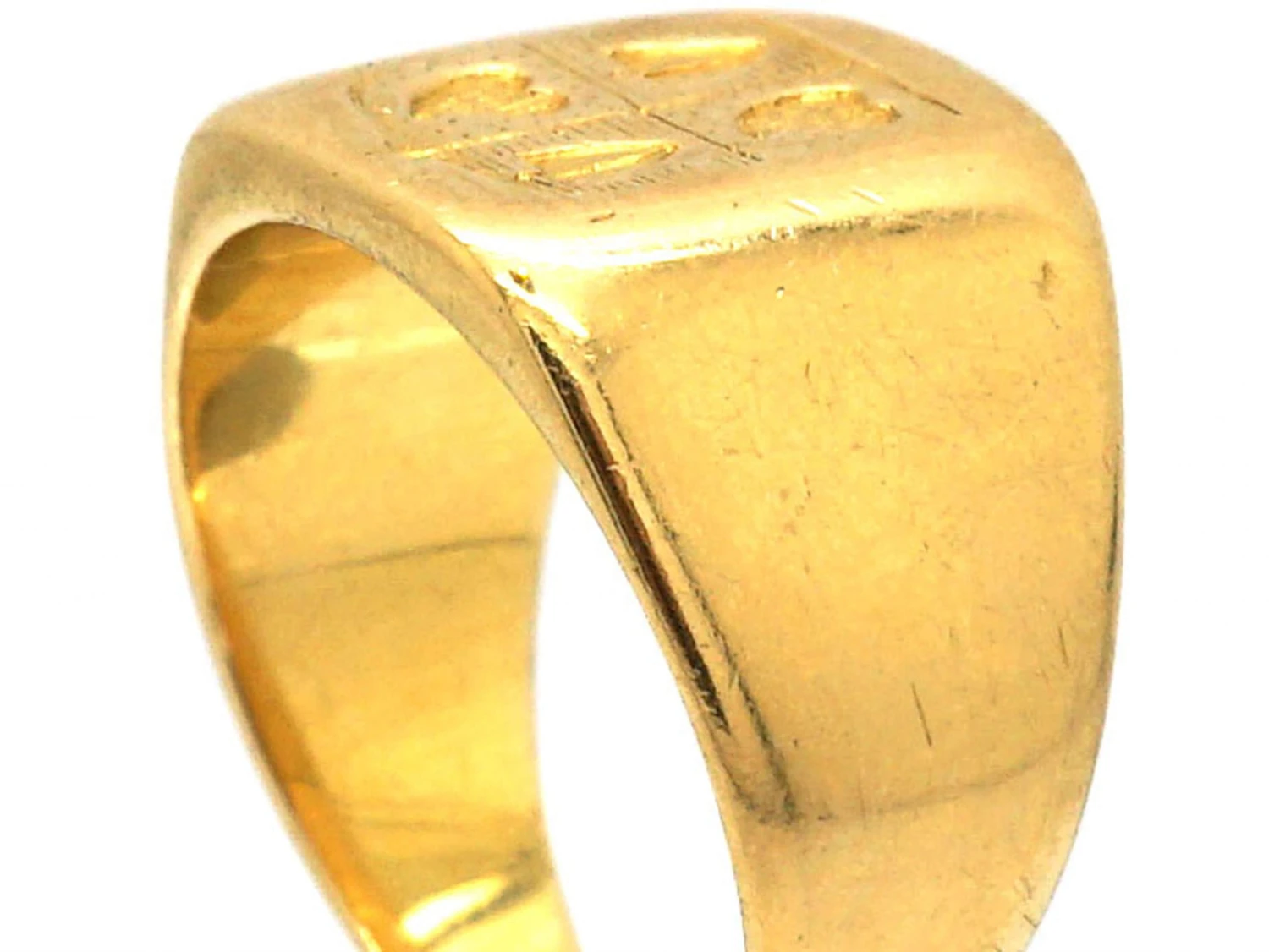 An unusual 18ct75% pure gold (or 750 parts pure gold and 250 parts other metals) gold signet ringA ring with a central plaque on which one’s initials, a seal, or a crest is engraved. that was most likely made in Belgium and imported in to France circa 1900-1910. The shield shaped surround has two weeping hearts and two spades engraved inside. Weeping hearts were originally worn as amulets to protect against the evil eye and from witches stealing milk or harming newborn babies.  This ring is a tiny size so it would only fit a pinky finger. It can be sized up but not by very much.