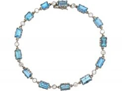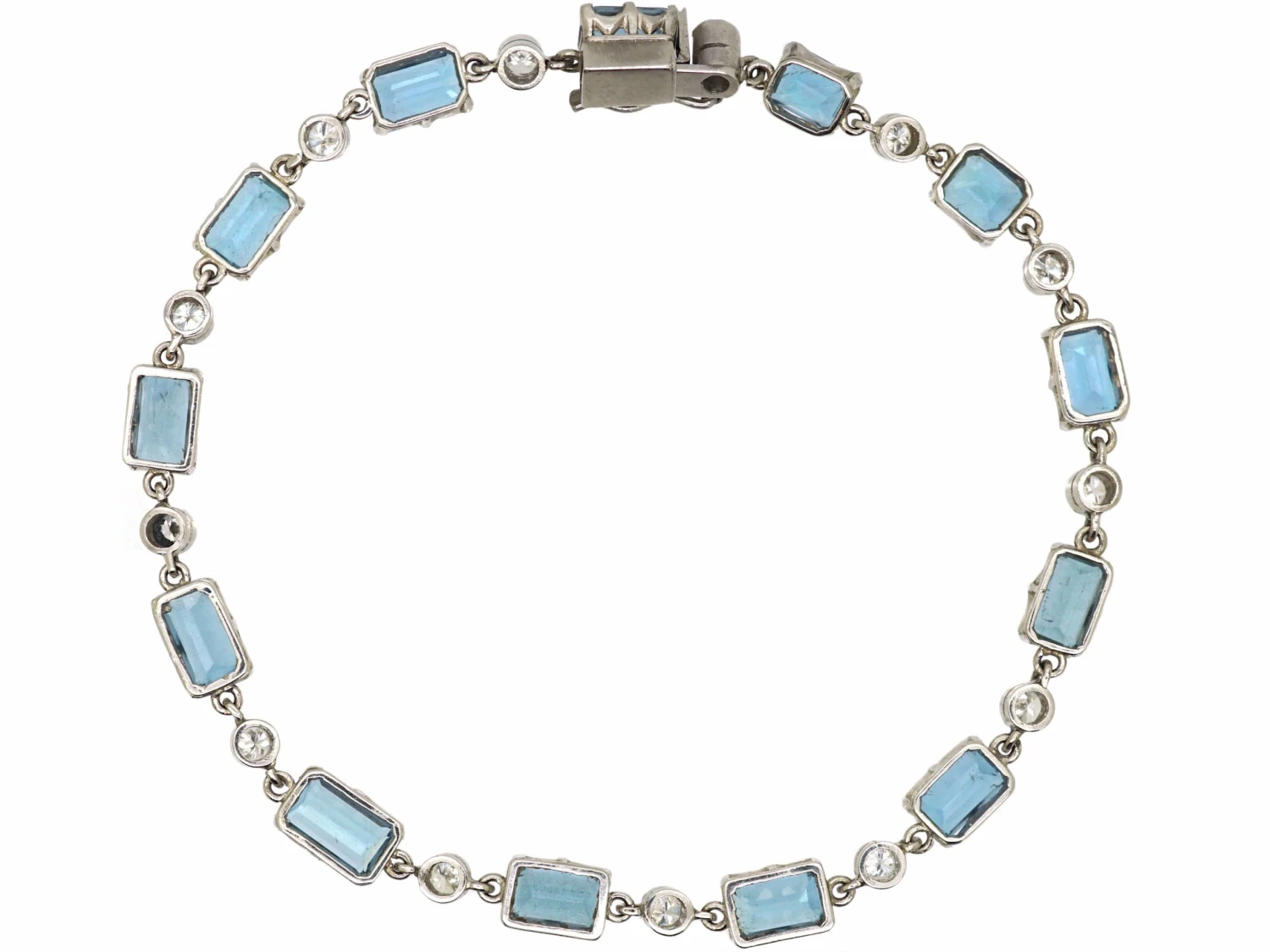 This is a gorgeous platinumDerives from the Spanish word ‘platina’ meaning ‘little silver’. Acknowledged since the 1900s, platinum’s durability and natural brightness has been and still is today highly treasured A metallic element prized for its rarity, whiteness, high tensile strength and insusceptibility to corrosion, platinum first became widely used in jewellery in the late ninete… bracelet that was made circa 1920. It has been clawA precious metal prong used to hold a gemstone in place. set with thirteen well matched rectangular cut aquamarines with bright white rub over set diamonds in between. Aquamarines are lovely stones and there are approximately just under four caratsThe unit of weight for a diamond or other gemstone and also for a pearl. Abbreviated ‘ct’, 1 carat is equal to 0.2 grams. In reference to gold, a unit of purity or fineness of gold and gold alloy, expressed as a number out of 24 parts by weight, e.g. ’24 carat’ signifies pure gold, ’18 carat’ 18/24th gold in the alloy, et cetera. Also abbreviated as ‘c… in this brooch. The seawater colour has given this gemstone its name as the word “aquamarineAquamarine (from the Latin, “water from the sea”) is a blue variety of the mineral, beryl, of which emerald is the less durable but more prized green variety. Aquamarine was believed to protect sailors at sea and banish fear.” is derived from the Latin word for seawater. The bracelet has a secure hidden tongue clasp with a hinged clip for added security.