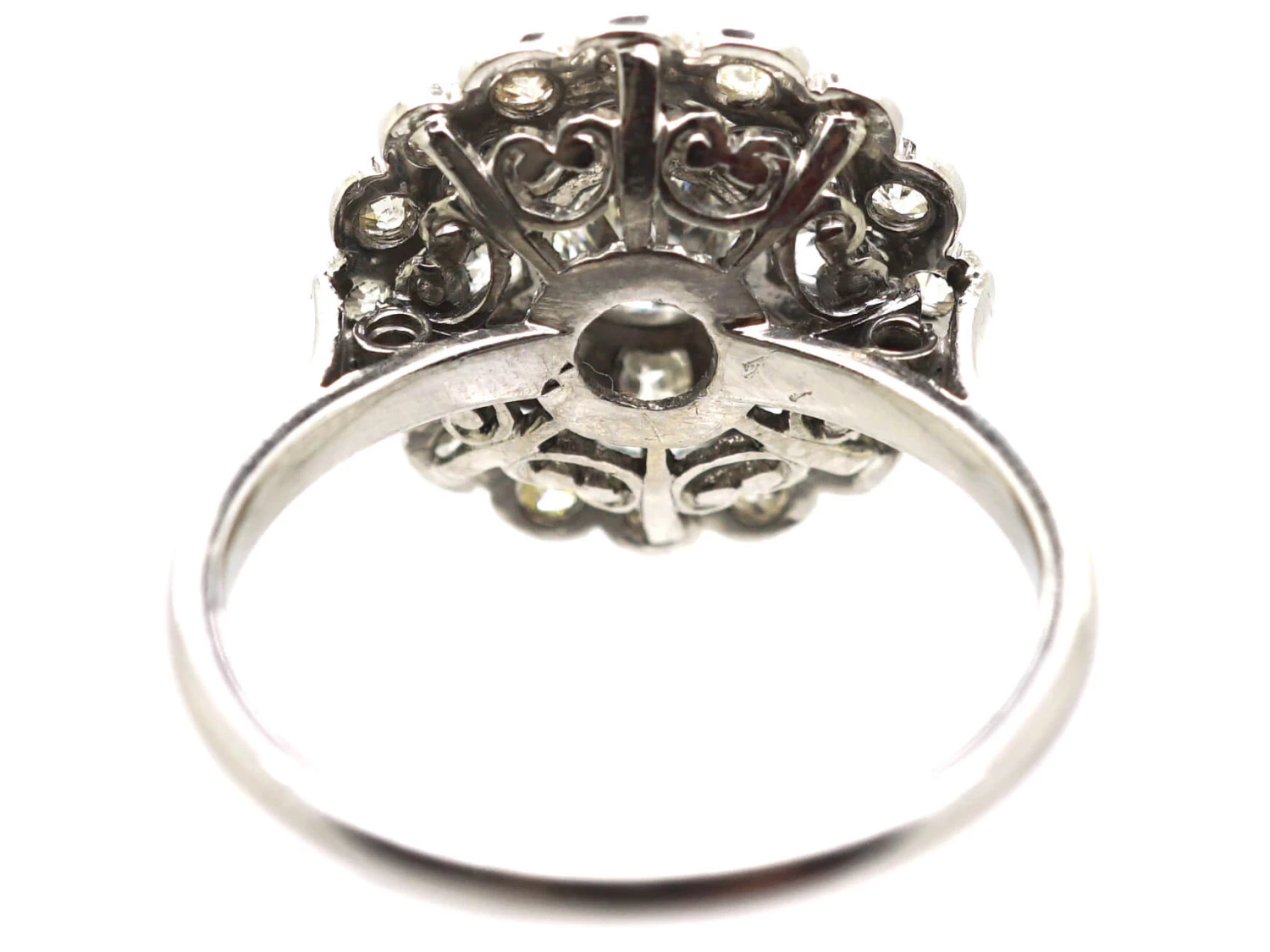 This is a really beautiful platinum and diamond daisy cluster ring that was made circa 1910-1920. In the centre is a diamond daisy cluster surrounded by an outer ring of diamonds. The pierced work gallery underneath is unusual. It has added millgrain detail that helps to make this ring really special.