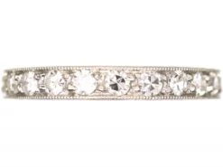 set with well matched old European cutGemstones cut in this style have a smaller table than the round brilliant and the overall depth is greater. This style of cutting was popular in the 19th Century and is the direct predecessor to the modern round Brilliant Cut. Similar to the Old Mine Cut. diamonds. Both sides of this ring have been engraved and the engraving is still as clear and crisp as it was when this ring was made circa 1910-1920 in England. It is very unusual to find an eternity ring in such a small size! Please note, this ring cannot be sized.
