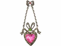 pendant that was made circa 1910. It is a typical design for the EdwardianJewellery made in the Edwardian era (1901-1914). period with a heart and bow motif. The heart has been set with a pink pasteGlass made to resemble gem materials, which may be moulded, faceted, carved, etc. with a small green paste above. Around and above the heart is graduated marcasiteThe marcasite of jewellery is in fact iron pyrite as marcasite itself is too brittle alone for the durability required of a piece. This jewellery marcasite is sometimes called ‘fool’s gold’ given its heavily metallic appearance. Marcasite of this kind also offers a kind of iridescence, explaining its use as a more affordable diamond replacement that wi… (iron pyrites) that imitate the hard glitter of rose diamonds. I love the tiny bow above that has also been set with a small pink paste and marcasite and suspends the heart on two silver chains.