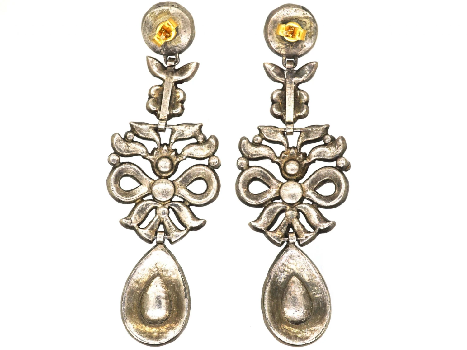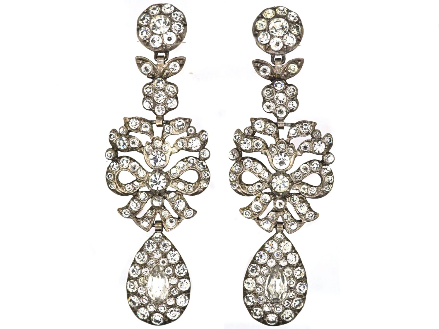 and pasteGlass made to resemble gem materials, which may be moulded, faceted, carved, etc. earrings that were made circa 1900 when there was a revival in GeorgianJewellery made in the Georgian era (1714-1830). designs. Paste jewellery is becoming increasingly sought after and early paste has the most beautiful sparkle. These earrings may have been made to imitate the owners diamondA precious, lustrous gemstone made of highly compressed carbon. Diamonds are one of the hardest materials known to mankind. Colours of diamonds range from colourless, yellow, orange and brown to almost black. Natural coloured (or ‘fancy’) diamonds can be extremely rare. The cut, colour, clarity and carat weight of a diamond are the criteria jewellers use… pair to wear when travelling. They look as striking today as they did when they were made!