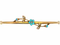 A narrow 10ct gold bangle that was made circa 1900-1910. It has a sweet hidden meaning because of the “Forget me not” flower in the centre. The flower has been set with turquoiseTurquoise is an opaque gem and is often formed in what is called matrix, a black or brown veining derived from the host rock in which the gem forms. In fine jewellery, unblemished sky blue turquoise is the ideal, although regularly patterned matrix turquoise is also sought-after. and the leaves have been set with naturalA natural stone is called such because it has not been subjected to any treatments. split pearls. It has a secure tongue clasp and a safety chainA small chain applied to a piece of jewellery with the purpose of adding additional security to prevent loss. On bracelets and necklaces a safety chain will often join the clasp ends should the clasp fail. On a brooch it is often attached to a small pin which is to be used in tandem with the main brooch pin. for extra security.