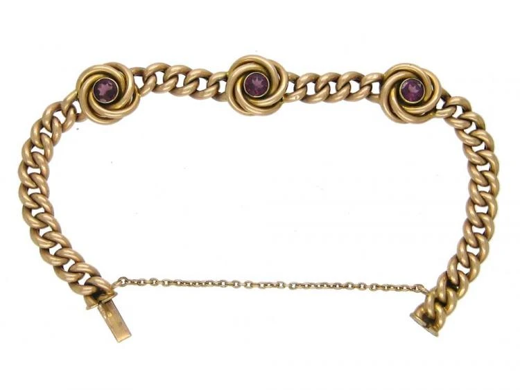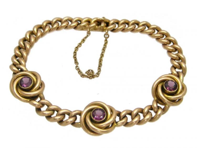 This 15ct62.5% pure gold (or 625 parts pure gold and 375 parts other metals). Popular during the Victorian, Edwardian and Art Deco eras but was discontinued in the mid-1930s. gold bracelet was made circa 1900-1910. The three almandineA variety of red garnet that is transparent and commonly deep crimson with tinges of purple. Its colour can resemble that of ruby. It is cut in several forms; when cut en cabochon (usually as hollow cabochon to lighten the colour), it is called carbuncle. garnets have been set within gold knot motifs and have a slight purplish tint.