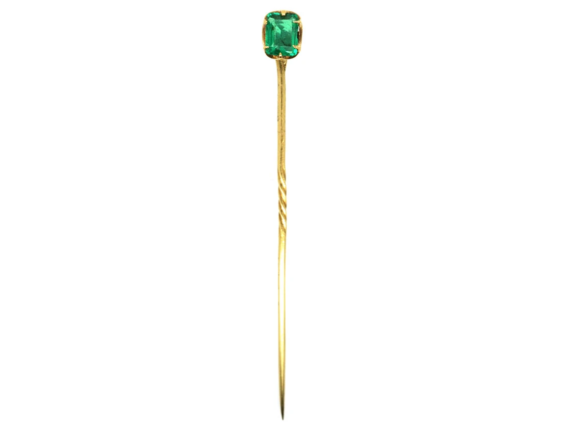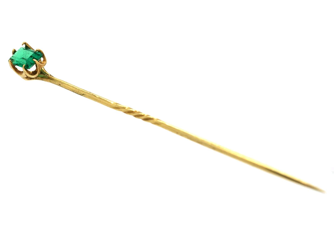 A convincing gold and emeraldOne of the four âpreciousâ stones. An intense, deep green is the most desirable colour for emeralds. Flaws and cloudiness (âjardinâ) are very common in emeralds, so stones are often oiled, irradiated, and dyed to improve their look. Synthetic emeralds have fewer imperfections and are hard to set apart from natural stones. Emeralds belong to the beryl… tie pin, but it is not an emerald. It is pasteGlass made to resemble gem materials, which may be moulded, faceted, carved, etc. , but you could fool anyone as it is so realistic! All our tie pins come with a stopper at the end of the pin.