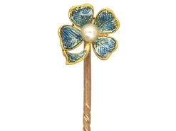 A pretty and lucky four leaf clover tie pin. It is 15ct62.5% pure gold (or 625 parts pure gold and 375 parts other metals). Popular during the Victorian, Edwardian and Art Deco eras but was discontinued in the mid-1930s. gold and has been enamelled in a translucent pale blue colour. It was made circa 1900-1910. All our tie pins come with a stopper at the end of the pin.