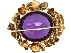 A lovely 15ct62.5% pure gold (or 625 parts pure gold and 375 parts other metals). Popular during the Victorian, Edwardian and Art Deco eras but was discontinued in the mid-1930s. gold novelty brooch of a mother sitting next door to a baby owl on a branch. They are beautifully modelled with pearlNatural pearls are an organic gem formed inside live mollusc shells and come in all shapes and sizes. They are formed as the result of a natural irritant within the mollusc’s mantle and as a defence, layers of iridescent nacre form over the top of it, creating a pearl. bodies, orange enamelA pigmented glass-like material used in powdered form and fused onto the metal surface of a piece of jewellery. wings and little black enamel eyes. The brooch was made circa 1915.