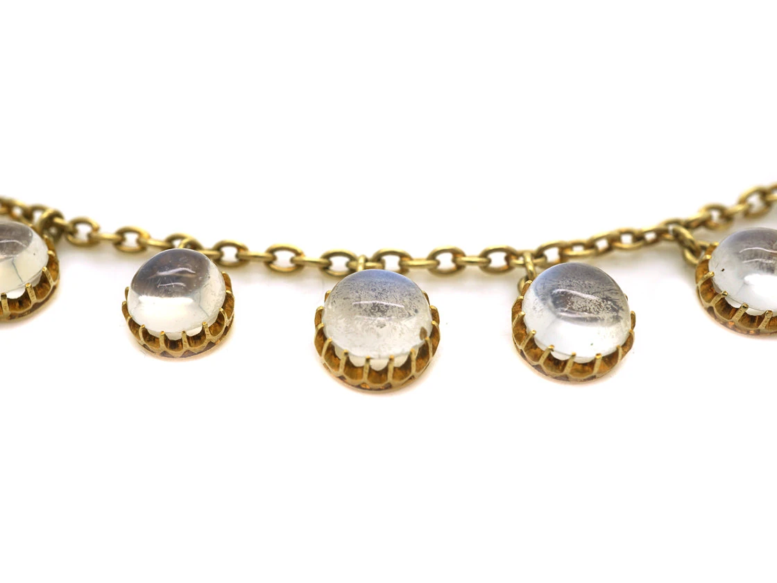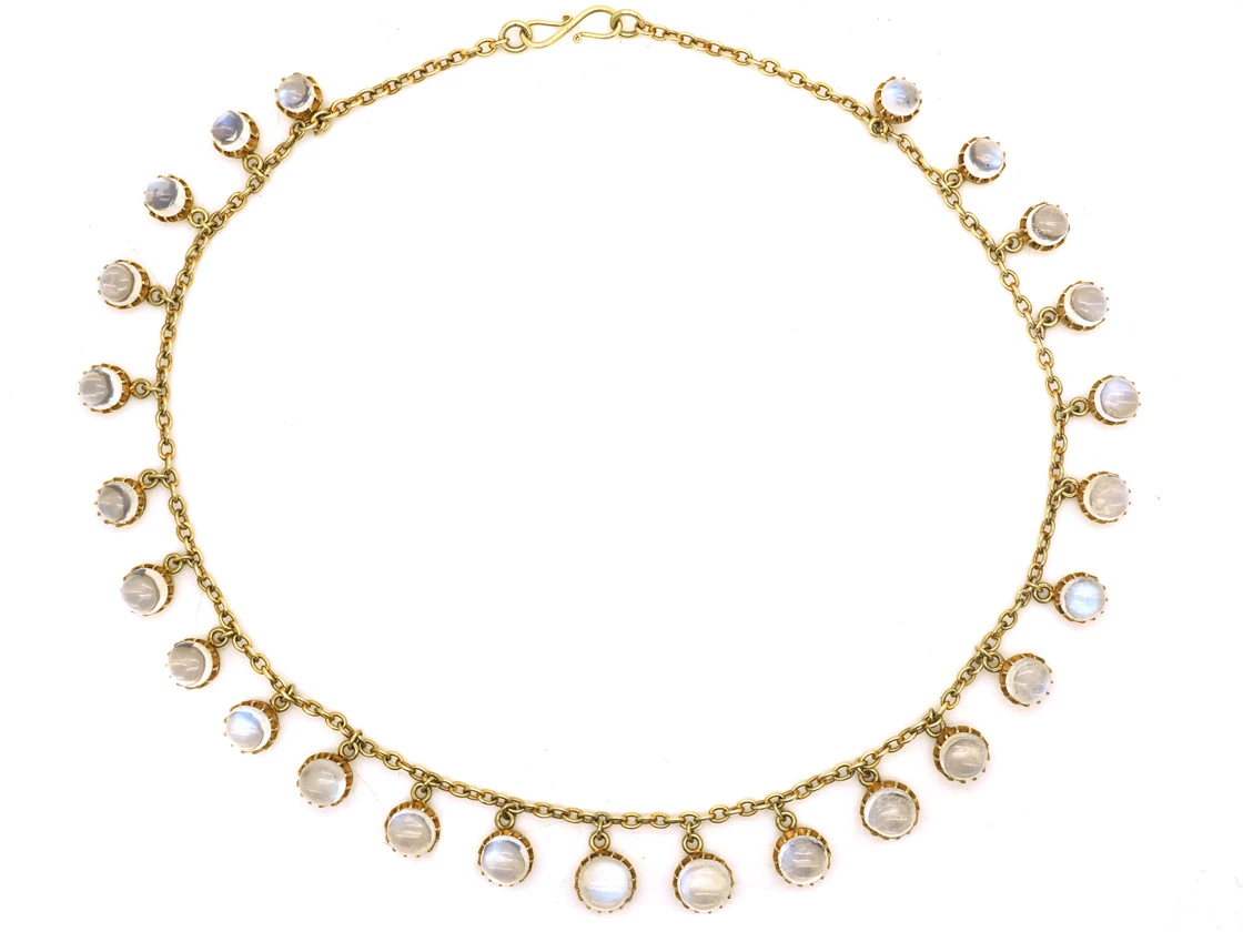 A lovely 15ct62.5% pure gold (or 625 parts pure gold and 375 parts other metals). Popular during the Victorian, Edwardian and Art Deco eras but was discontinued in the mid-1930s. gold necklace with twenty five moonstoneMoonstone, the alluring pale gemstone, is known for its attractive pearly sheen and is so named for its resemblance to the moon. drops. It was made circa 1900-1915 when moonstones were very fashionable as they went with the pale colours of the clothes worn then. Moonstone is a stone of protection for traveling at night, voyaging at sea, childbirth, and pregnancy, so it could be an appropriate present for any of the above.