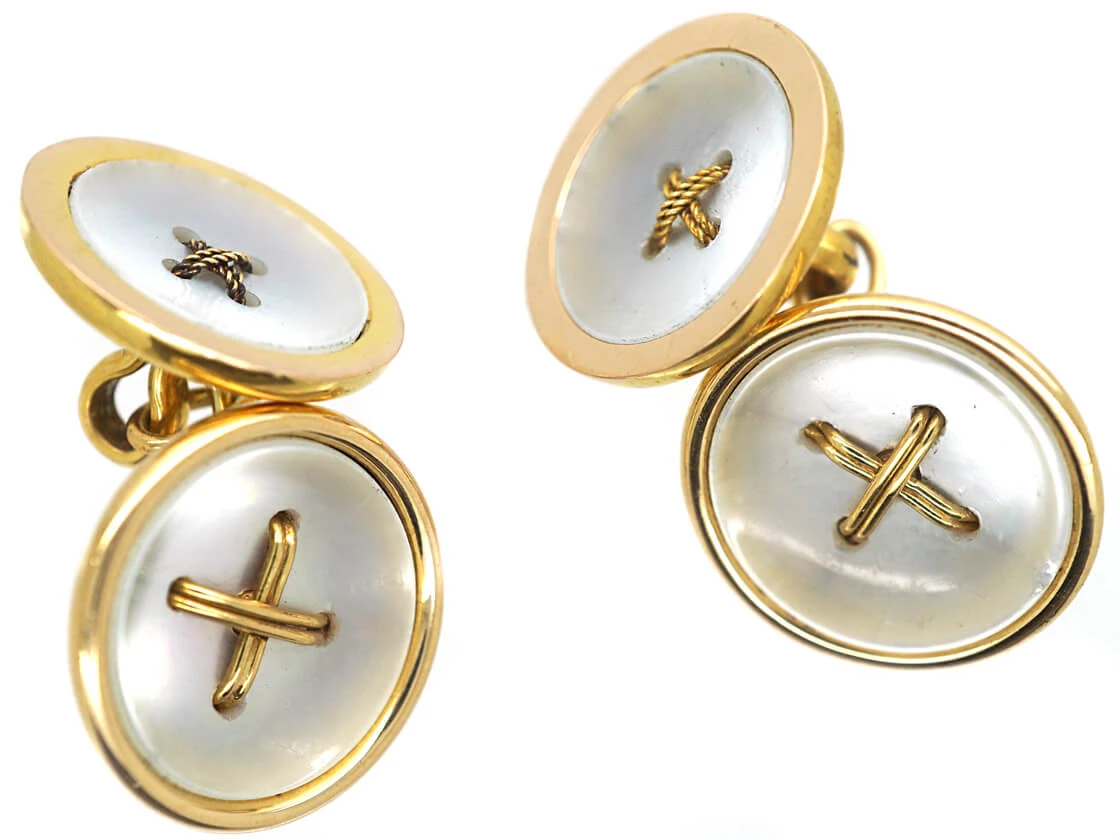 A smart pair of 15ct62.5% pure gold (or 625 parts pure gold and 375 parts other metals). Popular during the Victorian, Edwardian and Art Deco eras but was discontinued in the mid-1930s. gold cufflinks that look like values set with mother of pearlThe iridescent inner layer of certain molluscs such as oysters or abalones which is used as a decorative inlay. with a criss cross gold wire design in the centre. They were made circa 1910-1920.
