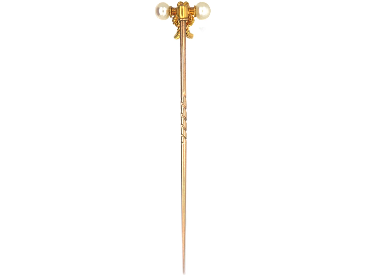 A neat looking 15ct62.5% pure gold (or 625 parts pure gold and 375 parts other metals). Popular during the Victorian, Edwardian and Art Deco eras but was discontinued in the mid-1930s. gold tie pin that was made circa 1900-1910. It has a natural pearlA pearl-bearing mollusc that has not been tampered with by man to produce a cultivated pearl will produce a ‘natural pearl’. on either end with a braided gold knot in between. It would make a perfect gift to a bridegroom as the meaning is “Tying the knot”. All our tie pins come with a stopper at the end of the pin.