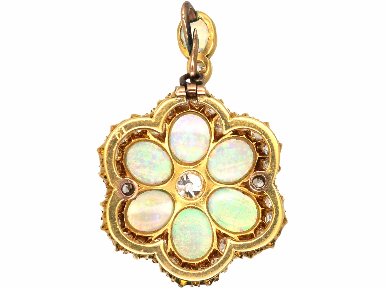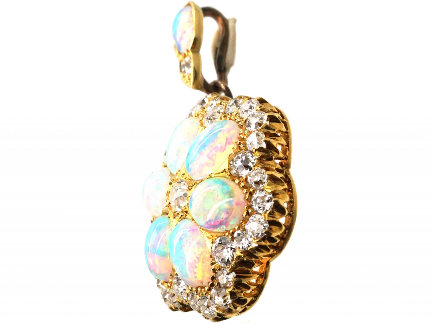 This is a truly gorgeous 15ct62.5% pure gold (or 625 parts pure gold and 375 parts other metals). Popular during the Victorian, Edwardian and Art Deco eras but was discontinued in the mid-1930s. gold pendant that was made circa 1910. At that time the new and exciting stones on the block were opals that were being imported from Australia. No one had seen such amazing vibrant opals like these before as previously opals had come from Hungary and were rather dull in comparison. The stones were celebrated and set in to pendants, rings, and bracelets. This pendant is a superb example of the best well matched opals with plenty of vivid blue and green flashes with red undertones. Around them are old mine cutAn 18th, 19th and early 20th century diamond shape, typically cushion or asymmetrical, marked by a small table, a high crown and a large culet. Culets are the small flat facets at the bottom of a stone which appear to the untrained eye as a hole in the middle of the stone. Before the advent of modern machinery which allows for the precise faceting we see tod… diamonds with a slightly larger old mine cut diamondA precious, lustrous gemstone made of highly compressed carbon. Diamonds are one of the hardest materials known to mankind. Colours of diamonds range from colourless, yellow, orange and brown to almost black. Natural coloured (or ‘fancy’) diamonds can be extremely rare. The cut, colour, clarity and carat weight of a diamond are the criteria jewellers use… in the centre. The hinged baleA component of certain types of jewellery, mostly necklaces, that is used to attach a pendant or stone to a chain.  has a further opalOpals occur in a range of body colours from white, black or grey, bright orangey red and a pale watery colour. The most precious opals show strong colour contrast and generally have a dark body colour with a vivid array of colour play. and diamond set in to it.