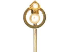 This elegant EdwardianJewellery made in the Edwardian era (1901-1914). tie pin is made from 15ct62.5% pure gold (or 625 parts pure gold and 375 parts other metals). Popular during the Victorian, Edwardian and Art Deco eras but was discontinued in the mid-1930s. gold with two naturalA natural stone is called such because it has not been subjected to any treatments. pearls. One larger pearlNatural pearls are an organic gem formed inside live mollusc shells and come in all shapes and sizes. They are formed as the result of a natural irritant within the mollusc’s mantle and as a defence, layers of iridescent nacre form over the top of it, creating a pearl. floats inside a gold circle beneath a smaller pearl encased in gold with milgrain detailing. The simple geometric design has a timeless appeal. All our tie pins come with a stopper at the end of the pin.