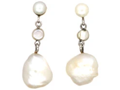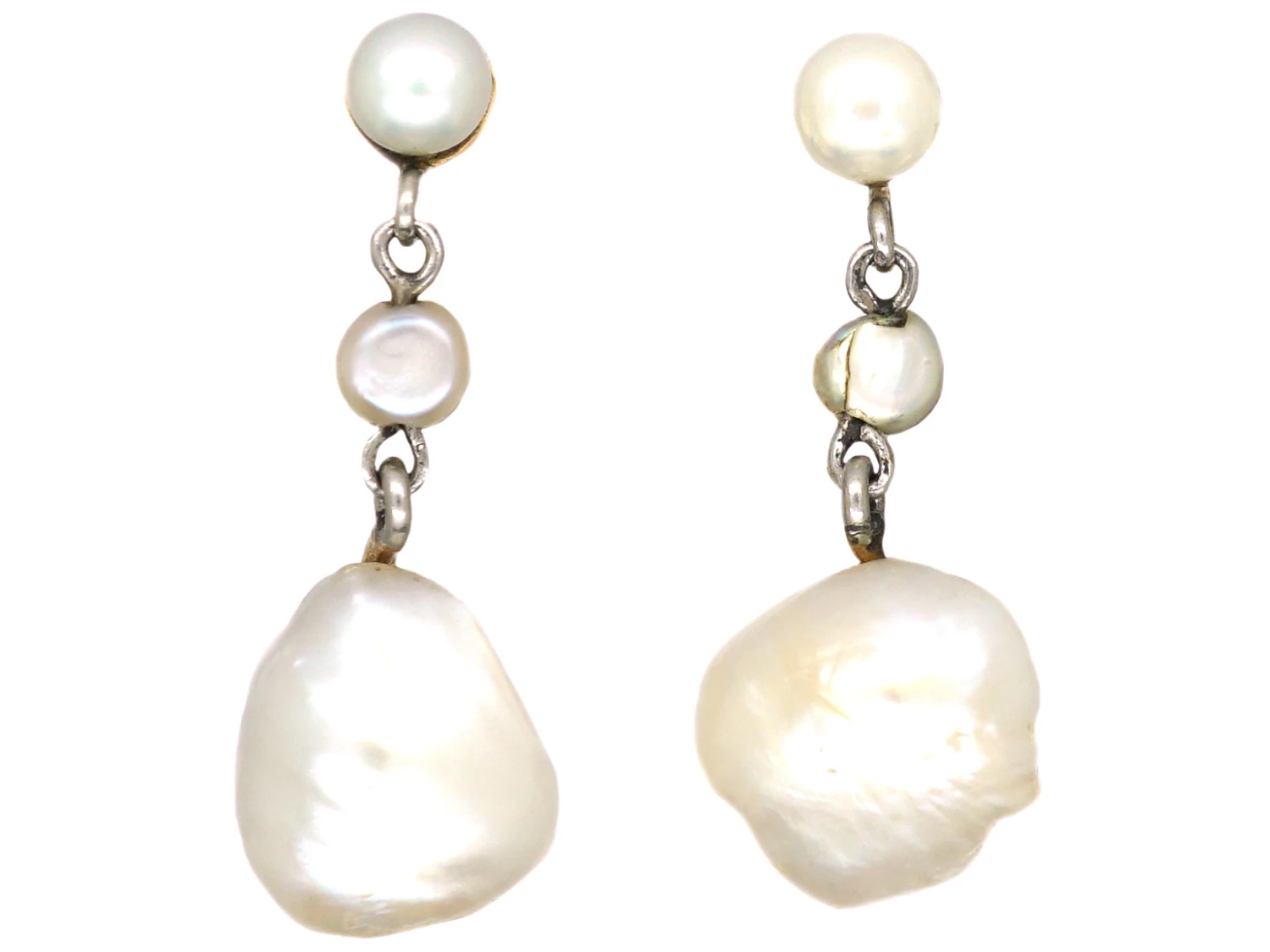 A pretty pair of 15ct62.5% pure gold (or 625 parts pure gold and 375 parts other metals). Popular during the Victorian, Edwardian and Art Deco eras but was discontinued in the mid-1930s. gold and platinumDerives from the Spanish word ‘platina’ meaning ‘little silver’. Acknowledged since the 1900s, platinum’s durability and natural brightness has been and still is today highly treasured A metallic element prized for its rarity, whiteness, high tensile strength and insusceptibility to corrosion, platinum first became widely used in jewellery in the late ninete… drop earrings that were made circa 1910. Each earring has a large baroque pearlNatural pearls are an organic gem formed inside live mollusc shells and come in all shapes and sizes. They are formed as the result of a natural irritant within the mollusc’s mantle and as a defence, layers of iridescent nacre form over the top of it, creating a pearl. with two smaller pearls above joined with platinum links. At that time jewels set with pearls were very popular especially baroque pearls as they were prized for their irregular shapes.