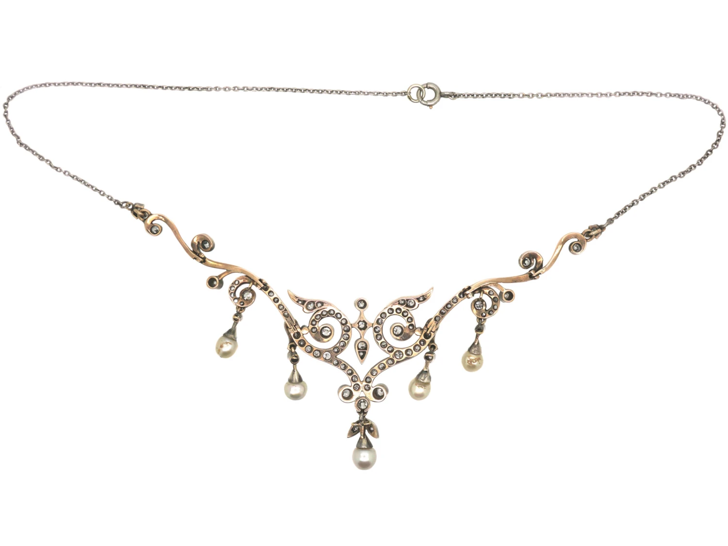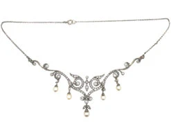 A very pretty diamondA precious, lustrous gemstone made of highly compressed carbon. Diamonds are one of the hardest materials known to mankind. Colours of diamonds range from colourless, yellow, orange and brown to almost black. Natural coloured (or ‘fancy’) diamonds can be extremely rare. The cut, colour, clarity and carat weight of a diamond are the criteria jewellers use… necklace that was made circa 1900-1910. It is beautifully presented in the original case which is sea green leather with gold tooling. It was retailed by the well known firm William Bruford & Sons Ltd who were based in 132 Terminus Rd Eastbourne and also in Exeter and have traded since 1886. The design is typical of the period with diamond set swags and volutes and five natural pearlA pearl-bearing mollusc that has not been tampered with by man to produce a cultivated pearl will produce a ‘natural pearl’. drops. There are many fine details including the diamond set caps on the pearls. It is typical of the EdwardianJewellery made in the Edwardian era (1901-1914). period in it’s light feel and looks so lovely when worn.