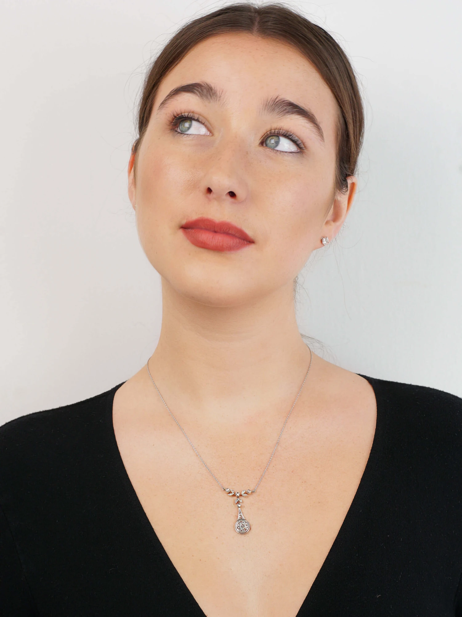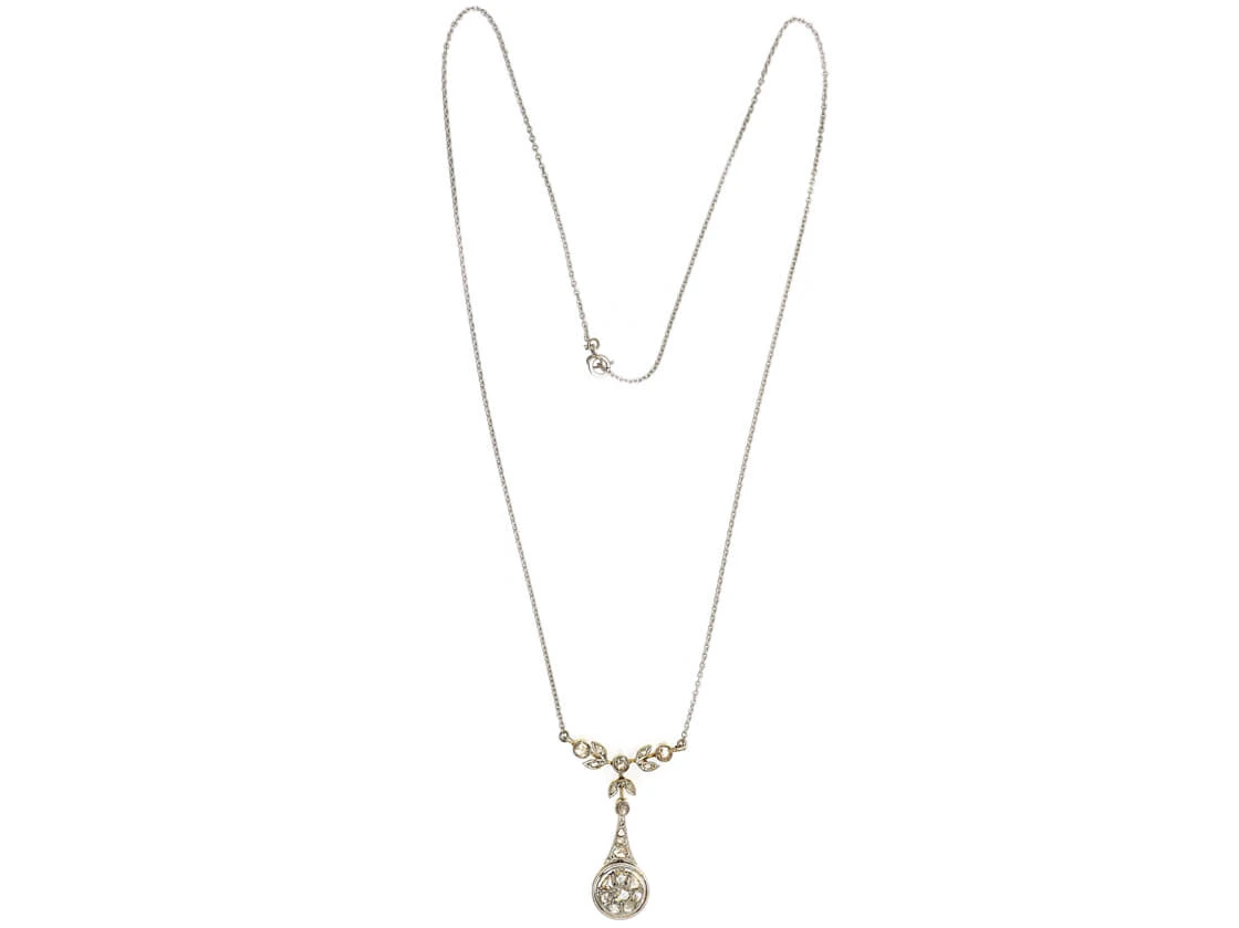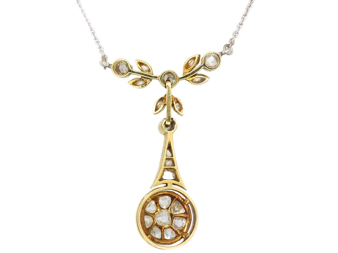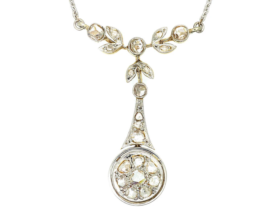 A lovely pendant on chain that was made circa 1900-1914 in Holland. The chain is platinumDerives from the Spanish word ‘platina’ meaning ‘little silver’. Acknowledged since the 1900s, platinum’s durability and natural brightness has been and still is today highly treasured A metallic element prized for its rarity, whiteness, high tensile strength and insusceptibility to corrosion, platinum first became widely used in jewellery in the late ninete… and the pendant is platinum fronted and 15ct62.5% pure gold (or 625 parts pure gold and 375 parts other metals). Popular during the Victorian, Edwardian and Art Deco eras but was discontinued in the mid-1930s. yellow gold on the reverse. It has been set with graded rose diamonds so the effect when worn is quite low key and smart.