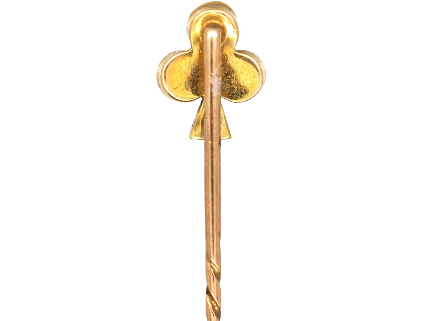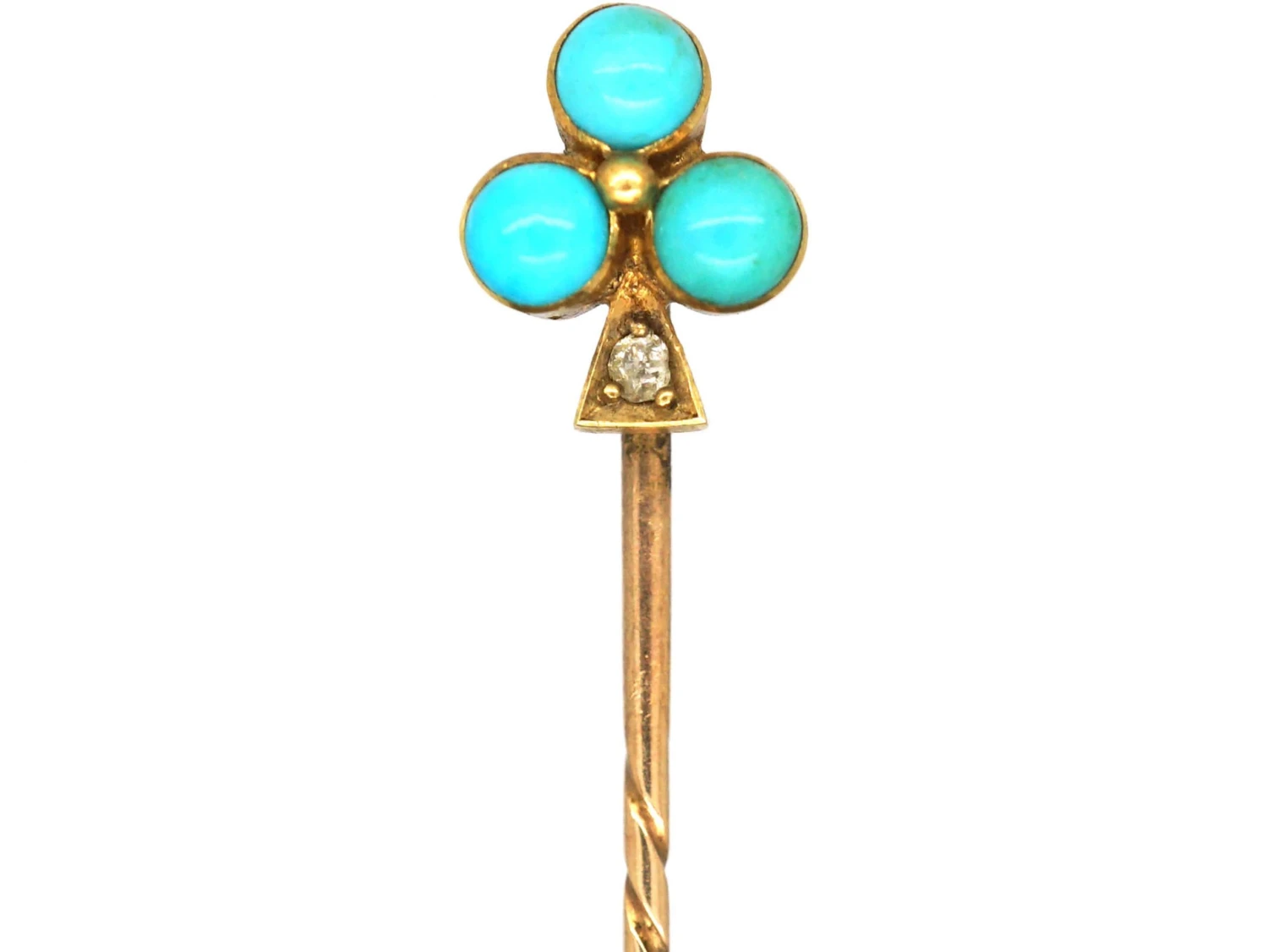A smart and lucky 15ct62.5% pure gold (or 625 parts pure gold and 375 parts other metals). Popular during the Victorian, Edwardian and Art Deco eras but was discontinued in the mid-1930s. gold tiepin of a shamrock that has been set with three split turquoiseTurquoise is an opaque gem and is often formed in what is called matrix, a black or brown veining derived from the host rock in which the gem forms. In fine jewellery, unblemished sky blue turquoise is the ideal, although regularly patterned matrix turquoise is also sought-after. beads with a diamondA precious, lustrous gemstone made of highly compressed carbon. Diamonds are one of the hardest materials known to mankind. Colours of diamonds range from colourless, yellow, orange and brown to almost black. Natural coloured (or ‘fancy’) diamonds can be extremely rare. The cut, colour, clarity and carat weight of a diamond are the criteria jewellers use… set in to the stem. It was made circa 1910. A good look to wear on a cravat or blazer. All our tiepins come with a stopper at the end of the pin.
