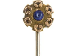 A lovely 15ct62.5% pure gold (or 625 parts pure gold and 375 parts other metals). Popular during the Victorian, Edwardian and Art Deco eras but was discontinued in the mid-1930s. gold tie pin that was made circa 1900-1910. It has been set with a cabochonA polished, not faceted, dome shaped stone – either round or oval with a flat polished base, primarily used as a cut for phenomenal stones such as cat’s eyes and stars.