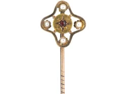 A good looking 15ct62.5% pure gold (or 625 parts pure gold and 375 parts other metals). Popular during the Victorian, Edwardian and Art Deco eras but was discontinued in the mid-1930s. gold tie pin that was made circa 1900-1910. It is a lovely design with a bright red garnetDescribes a group of several closely related minerals. Garnets come in a variety of colours, however the most common colour is dark red. In descriptions, ‘garnet’ tends to refer to dark red stones unless otherwise specified. in the centre and four pearls within a wavy gold frame. It looks very smart when worn. All our tie pins come with a stopper at the end of the pin.