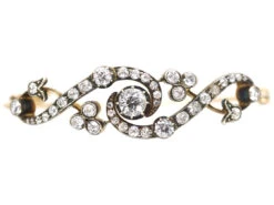 A stunning diamondA precious, lustrous gemstone made of highly compressed carbon. Diamonds are one of the hardest materials known to mankind. Colours of diamonds range from colourless, yellow, orange and brown to almost black. Natural coloured (or ‘fancy’) diamonds can be extremely rare. The cut, colour, clarity and carat weight of a diamond are the criteria jewellers use… bangle set with well matched and graded old mine cutAn 18th, 19th and early 20th century diamond shape, typically cushion or asymmetrical, marked by a small table, a high crown and a large culet. Culets are the small flat facets at the bottom of a stone which appear to the untrained eye as a hole in the middle of the stone. Before the advent of modern machinery which allows for the precise faceting we see tod… diamonds. The openwork design is so light and pretty. It was made circa 1900-1910.