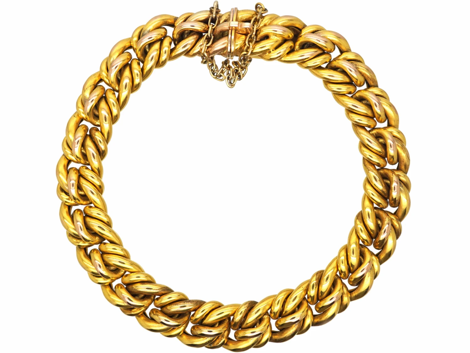 An unusual 15ct62.5% pure gold (or 625 parts pure gold and 375 parts other metals). Popular during the Victorian, Edwardian and Art Deco eras but was discontinued in the mid-1930s. gold bracelet that was made circa 1900-1915. The links are cleverly designed to look like double knots and the tongue clasp is hidden so it is a neat continuous motif. It has an added safety chainA small chain applied to a piece of jewellery with the purpose of adding additional security to prevent loss. On bracelets and necklaces a safety chain will often join the clasp ends should the clasp fail. On a brooch it is often attached to a small pin which is to be used in tandem with the main brooch pin. for extra security. It can be worn on its own or with other bracelets.