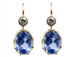and diamondA precious, lustrous gemstone made of highly compressed carbon. Diamonds are one of the hardest materials known to mankind. Colours of diamonds range from colourless, yellow, orange and brown to almost black. Natural coloured (or ‘fancy’) diamonds can be extremely rare. The cut, colour, clarity and carat weight of a diamond are the criteria jewellers use… earrings. The sapphires are very well matched and were sourced in CeylonSri Lankan (Ceylon was the country’s former name until 1972). They are a lovely cornflower blue colour and are 2.25 caratsThe unit of weight for a diamond or other gemstone and also for a pearl. Abbreviated ‘ct’, 1 carat is equal to 0.2 grams. In reference to gold, a unit of purity or fineness of gold and gold alloy, expressed as a number out of 24 parts by weight, e.g. ’24 carat’ signifies pure gold, ’18 carat’ 18/24th gold in the alloy, et cetera. Also abbreviated as ‘c… each.