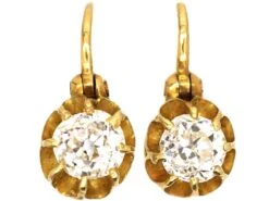 A useful pair of 18ct75% pure gold (or 750 parts pure gold and 250 parts other metals) gold solitaireAn enduringly popular style of engagement ring featuring a single diamond or gemstone set on a band. diamondA precious, lustrous gemstone made of highly compressed carbon. Diamonds are one of the hardest materials known to mankind. Colours of diamonds range from colourless, yellow, orange and brown to almost black. Natural coloured (or ‘fancy’) diamonds can be extremely rare. The cut, colour, clarity and carat weight of a diamond are the criteria jewellers use… earrings that can be worn on a daily basis. The diamonds are well matched old mine cutAn 18th, 19th and early 20th century diamond shape, typically cushion or asymmetrical, marked by a small table, a high crown and a large culet. Culets are the small flat facets at the bottom of a stone which appear to the untrained eye as a hole in the middle of the stone. Before the advent of modern machinery which allows for the precise faceting we see tod… stones and have been clawA precious metal prong used to hold a gemstone in place. set. The wires hinge up and then are caught by a hook securely when worn. They were made circa 1900-1910.