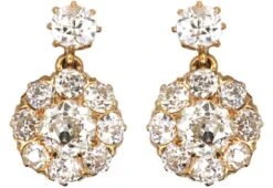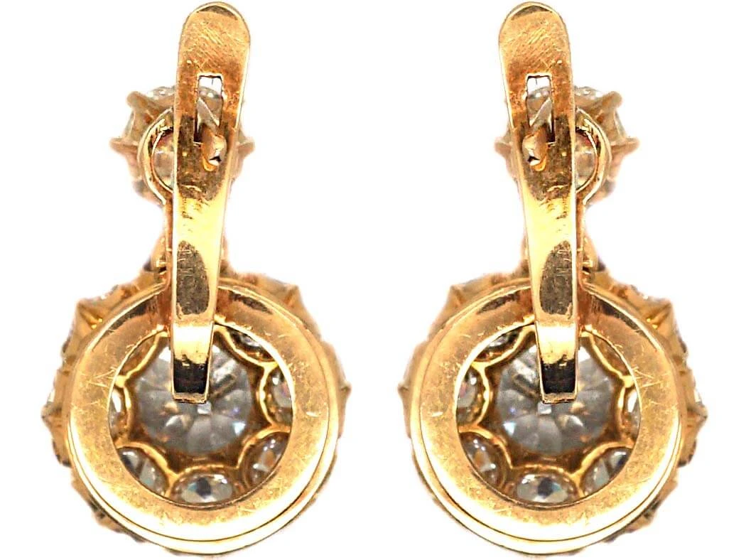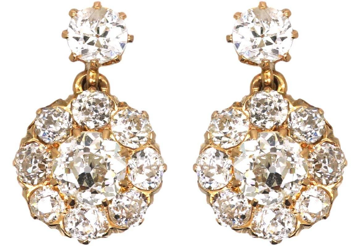 A fantastic pair of 18ct75% pure gold (or 750 parts pure gold and 250 parts other metals) gold diamondA precious, lustrous gemstone made of highly compressed carbon. Diamonds are one of the hardest materials known to mankind. Colours of diamonds range from colourless, yellow, orange and brown to almost black. Natural coloured (or ‘fancy’) diamonds can be extremely rare. The cut, colour, clarity and carat weight of a diamond are the criteria jewellers use… earrings that were made circa 1910. The diamonds are all well matched old mine cutAn 18th, 19th and early 20th century diamond shape, typically cushion or asymmetrical, marked by a small table, a high crown and a large culet. Culets are the small flat facets at the bottom of a stone which appear to the untrained eye as a hole in the middle of the stone. Before the advent of modern machinery which allows for the precise faceting we see tod… stones with a larger diamond in the centre of each clusterA group of small diamonds or colourful gemstones grouped together to form a cluster, mimicking the look of a larger gem. Often this group can surround a larger center stone. and eight smaller old mine cut diamonds surrounding each one. Above is another larger old mine cut diamond. They have a total estimated weight of four caratsThe unit of weight for a diamond or other gemstone and also for a pearl. Abbreviated ‘ct’, 1 carat is equal to 0.2 grams. In reference to gold, a unit of purity or fineness of gold and gold alloy, expressed as a number out of 24 parts by weight, e.g. ’24 carat’ signifies pure gold, ’18 carat’ 18/24th gold in the alloy, et cetera. Also abbreviated as ‘c… and are beautiful bright and well matched stones.
