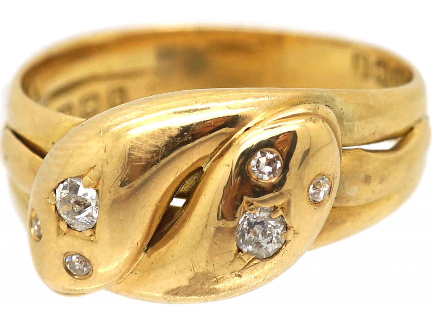 A beautiful 18ct75% pure gold (or 750 parts pure gold and 250 parts other metals) gold double snake ring that was assayed When the property or concentration of a precious metal is measured. in 1907 in Birmingham. The snakes are set with two small old mine cutAn 18th, 19th and early 20th century diamond shape, typically cushion or asymmetrical, marked by a small table, a high crown and a large culet. Culets are the small flat facets at the bottom of a stone which appear to the untrained eye as a hole in the middle of the stone. Before the advent of modern machinery which allows for the precise faceting we see tod… diamondA precious, lustrous gemstone made of highly compressed carbon. Diamonds are one of the hardest materials known to mankind. Colours of diamonds range from colourless, yellow, orange and brown to almost black. Natural coloured (or ‘fancy’) diamonds can be extremely rare. The cut, colour, clarity and carat weight of a diamond are the criteria jewellers use… eyes and a larger old mine cut diamond in their heads. Snake rings were popular in the GeorgianJewellery made in the Georgian era (1714-1830)., VictorianJewellery made in the the Victorian era (1839-1901). and EdwardianJewellery made in the Edwardian era (1901-1914). eras and signify the union of two people entwined for eternity. This ring would therefore be a perfect token of love to wear everyday.