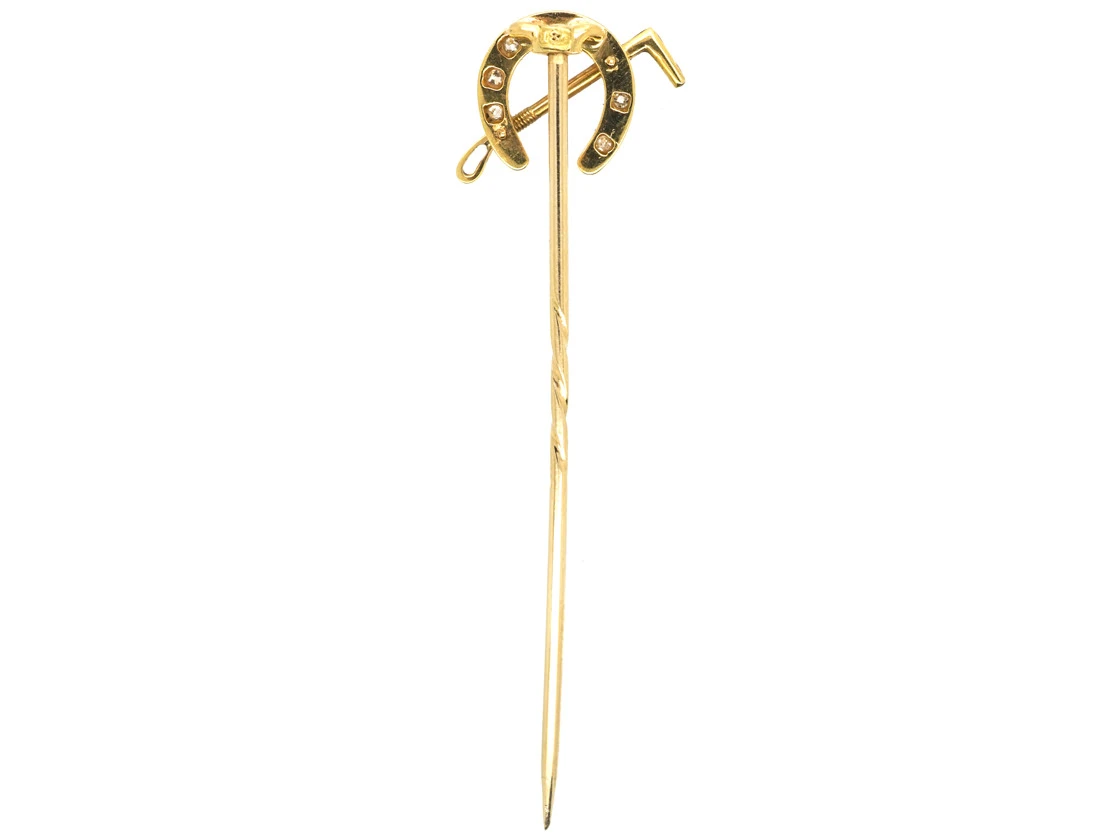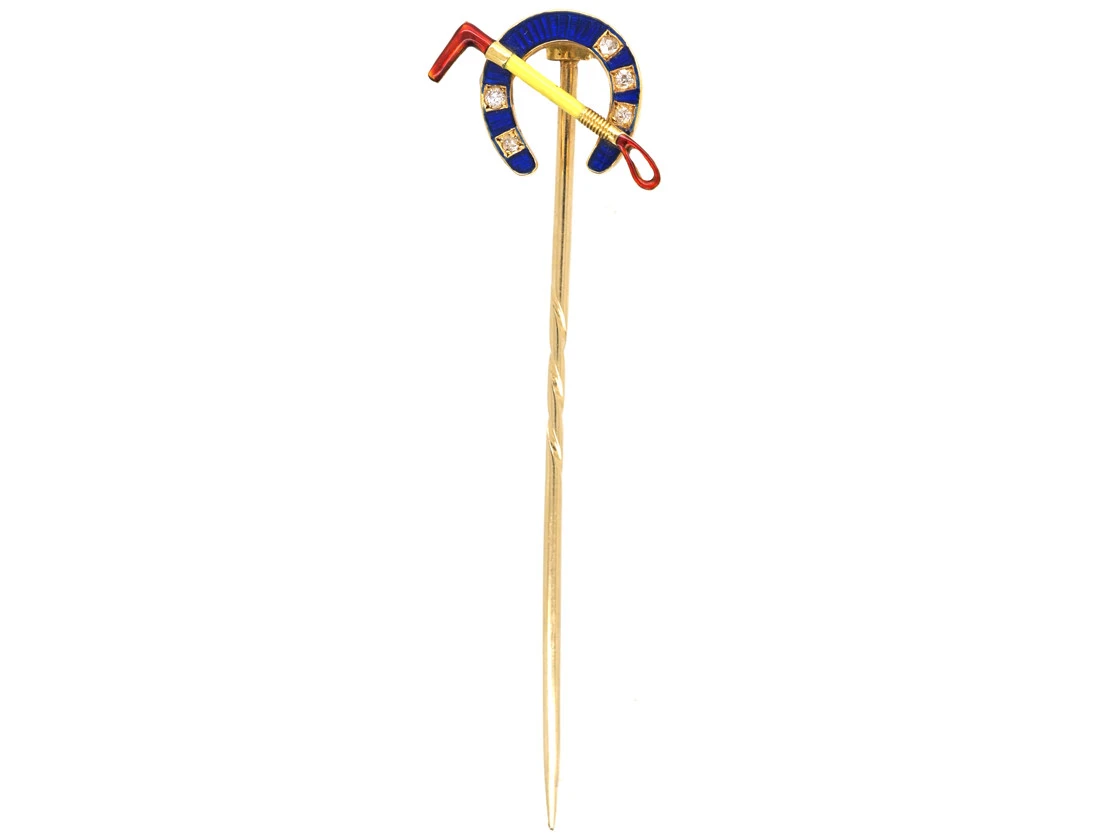 An unusual 18ct75% pure gold (or 750 parts pure gold and 250 parts other metals) gold tie pin that was made circa 1900-1910. It is a highly detailed piece of a horseshoe and a whip. The horseshoe is set with five small diamonds and has been enamelled in Royal blue. The whip has been enamelled in red and yellow. A perfect gift for a horse lover! All our tie pins come with a stopper at the end of the pin.