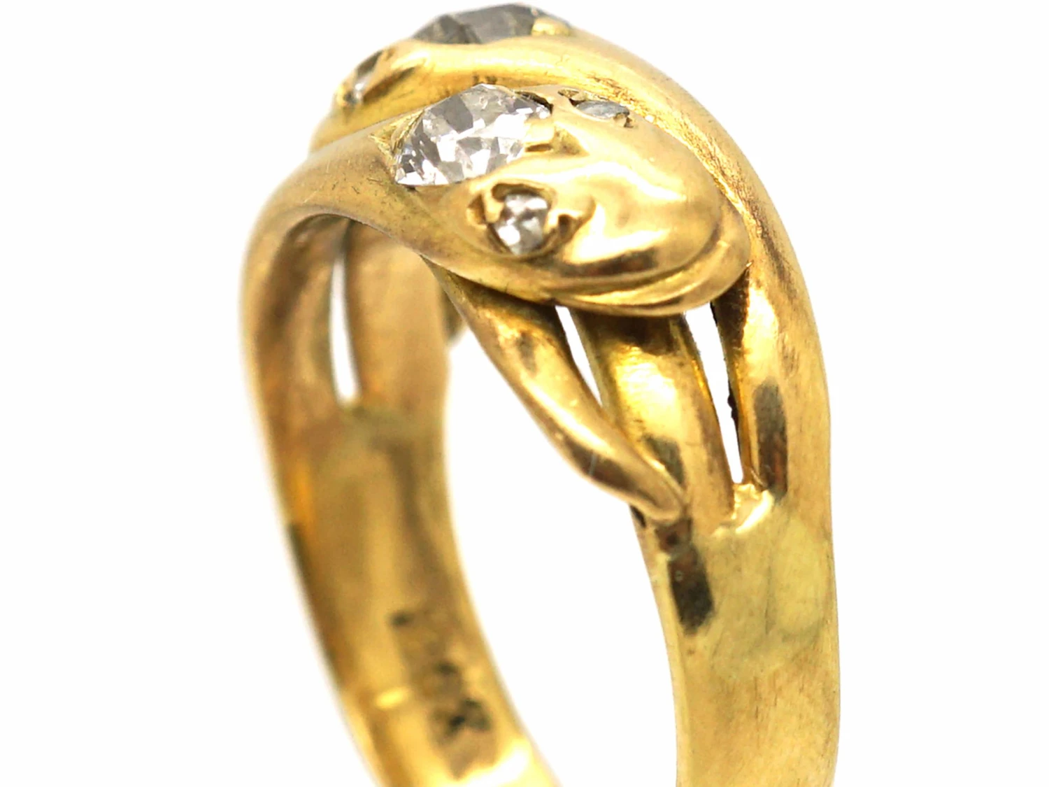 There are many snake rings over the years that we have been offered but we only choose the ones that have open mouths and appealing faces! This 18ct75% pure gold (or 750 parts pure gold and 250 parts other metals) gold ring is just perfect with two well modelled snakes with an old mine cutAn 18th, 19th and early 20th century diamond shape, typically cushion or asymmetrical, marked by a small table, a high crown and a large culet. Culets are the small flat facets at the bottom of a stone which appear to the untrained eye as a hole in the middle of the stone. Before the advent of modern machinery which allows for the precise faceting we see tod… diamondA precious, lustrous gemstone made of highly compressed carbon. Diamonds are one of the hardest materials known to mankind. Colours of diamonds range from colourless, yellow, orange and brown to almost black. Natural coloured (or ‘fancy’) diamonds can be extremely rare. The cut, colour, clarity and carat weight of a diamond are the criteria jewellers use… set in to each of their heads and sweet rose diamond set eyes. Snake rings were popular in the GeorgianJewellery made in the Georgian era (1714-1830)., VictorianJewellery made in the the Victorian era (1839-1901). and EdwardianJewellery made in the Edwardian era (1901-1914). eras and signify the union of two people in eternal love. This ring was made in 1898.