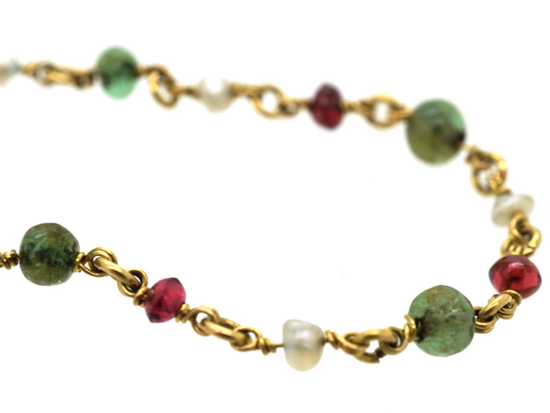 A very decorative 18ct75% pure gold (or 750 parts pure gold and 250 parts other metals) gold chain that was made circa 1910. The emeralds, rubies and pearls would have been sourced in India as huge amounts of gems were imported at that time from the Far East and made up in England.